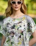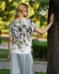 Блуза прямого силуэта. Выполнена с нанесением сублимационной печати с эффетом "омбре". Цельнокроенный, короткий рукав, плечо спущено. Вырез горловины лодочкой.Карманы. Нет.