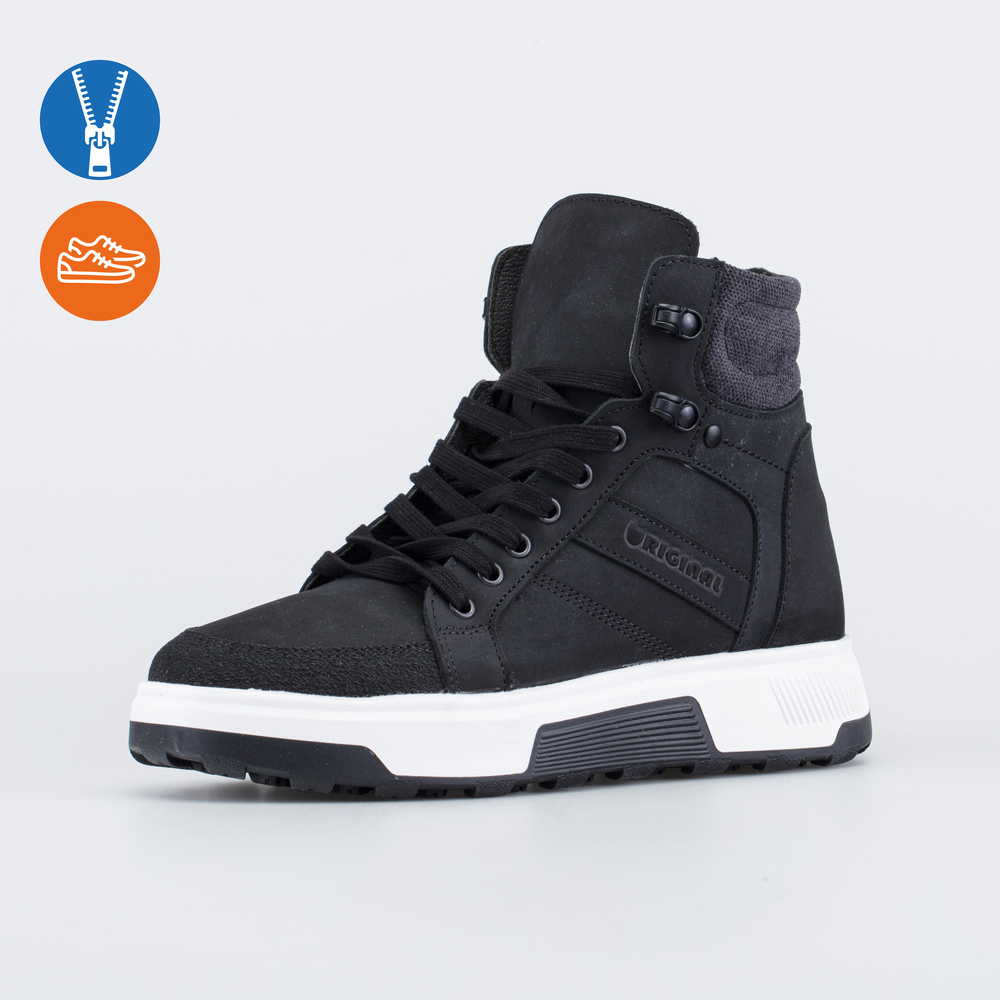 Высокие ботинки в спортивном стиле имеют байковый утеплитель и предназначены для осенней и весенней погоды. Выполнены из комбинации натуральной гладкой кожи и текстильного материала черного цвета. Под... Показать описаниекладка из байки (больше 80% натуральная овечья шерсть) и съемная войлочная стелька хорошо сохраняют тепло. Молния обеспечивает максимальную раскрываемость при обувании, а шнуровка позволяет подогнать обувь по ноге и надежно её зафиксировать. Пяточная и носочная части защищены натуральной кожей с полиуретановым покрытием. Внутри защита пятки от трения - кожаная накладка поверх утеплителя. Модель анатомически правильная: пяточная часть имеет приподнятость по отношению к носочной, что создает оптимальную поддержку. Подошва из ПУ легкая и отлично подходит для долгих прогулок. Сделано в России.