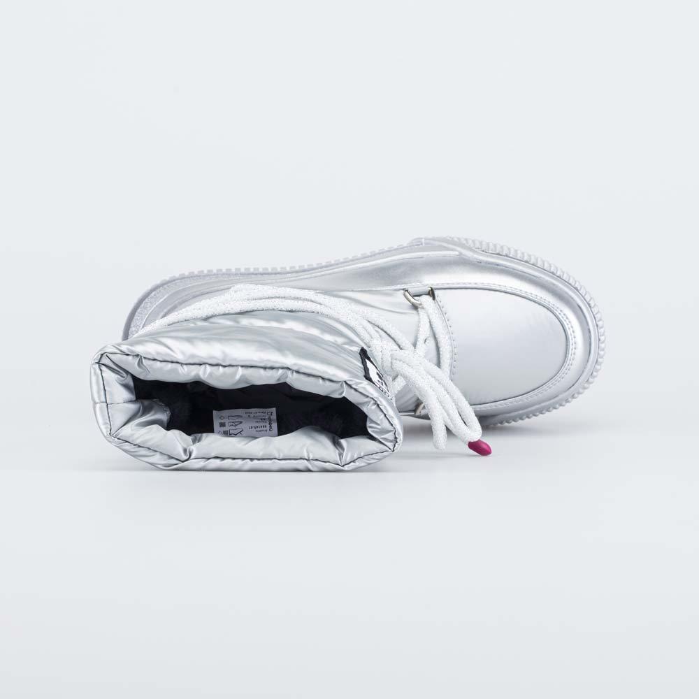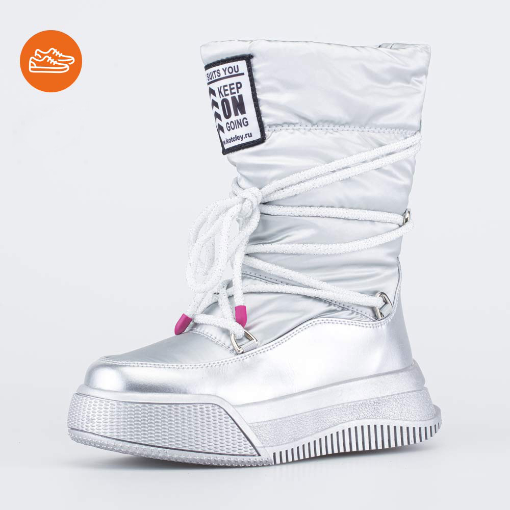 Зимние сапожки-дутики серебристого цвета подходят для девочки-подростка. Верх изготовлен из высокотехнологичного текстиля и защищает ножки от ветра, грязи и брызг. А благодаря многослойной структуре, ... Показать описаниеобразующей воздушную прослойку, отлично сохраняет тепло. Дополнительно согревает подкладка – шерстяной мех из натуральной овечьей шерсти. По всему периметру дутики защищены искусственной кожей, предохраняющей от влаги и реагентов. Подошва из термопластичной резины обладает хорошей устойчивостью на зимних дорожках и сохраняет гибкость даже при сильных морозах. Дутики декорированы нашивкой и массивным шнурком, огибающим сапожок в несколько обхватов. Модель анатомически-правильная: выполнена с учетом особенностей подростковой стопы.