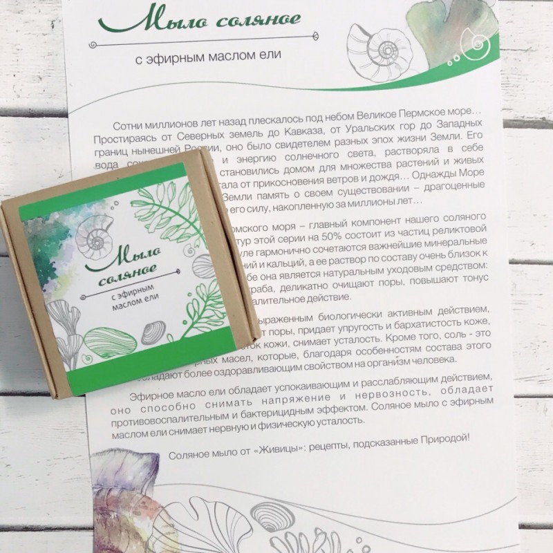 Соляное мыло обладает выраженным биологически активным действием, дезинфицирует, активно очищает поры, придает упругость и бархатистость коже, стимулирует обновление клеток кожи, снимает усталость. Кр... Показать описаниеоме того, соль - это «проводник» эфирных масел, которые, благодаря особенностям состава этого мыла обладают более оздоравливающим свойством на организм человека. Эфирное масло ели обладает успокаивающим и расслабляющим действием, оно способно снимать напряжение и нервозность, обладает противовоспалительным и бактерицидным эффектом. Соляное мыло с эфирным маслом ели снимает нервную и физическую усталость. Вес: 80 гр. Состав: натриевые соли жирных кислот масла кокоса, соль древнего Пермского моря, вода, эфирное масло ели, минеральный пигмент и тепло наших рук! Срок годности: 24мес. Соляное мыло нельзя хранить в металлической мыльнице.