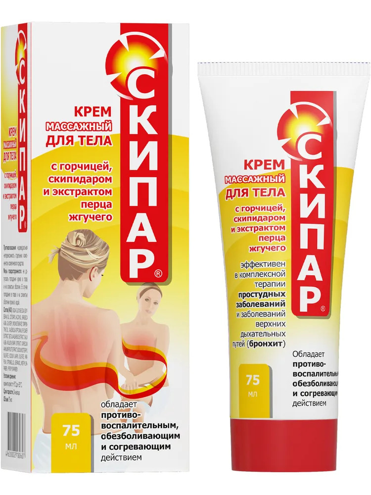 Крем для тела массажный Скипар эффективен в комплексной терапии простудных заболеваний и заболеваний верхних дыхательных путей (бронхит). Обладает противовоспалительным, обезболивающим и согревающим д... Показать описаниеействием. Крем предназначен для ухода за кожей тела, а также, благодаря своей консистенции и сбалансированному составу, подходит для проведения разогревающего массажа. Комплекс натуральных активных компонентов крема стимулирует обменные процессы в коже. Крем способствует предупреждению вялости и дряблости кожи.