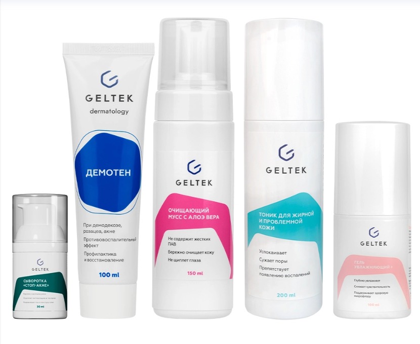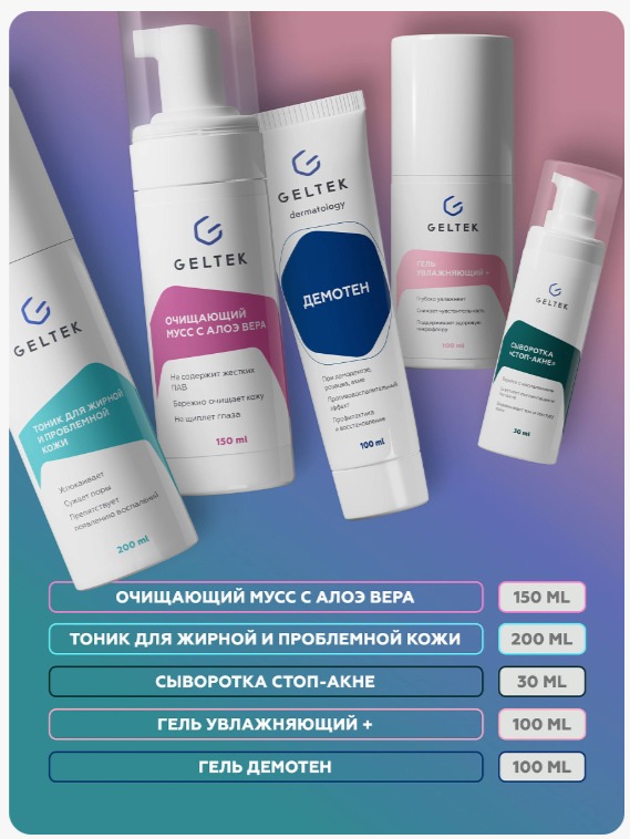 Комплекс средств, подходящий для подростковой кожи, как склонной к воспалениям, так и беспроблемной. В составе комплекса: • Мягкий очищающий бессульфатный мусс с приятной текстурой, без агрессивных ко... Показать описаниемпонентов, дружественный к микробиому и сохраняющий защитный барьер кожи. • Балансирующий тоник для завершения очищения, быстро восстанавливающий рН кожи после умывания. • Увлажняющий, успокаивающий гель с пребиотиком, который одинаково хорошо подходит для всех типов молодой кожи. • Сыворотка с 10%-ной азелаиновой кислотой, Д-пантенолом и себорегулирующим комплексом на основе цинка, магния и меди, которая предназначена для ухода за жирной, комбинированной, проблемной кожей или как средство S.O.S. при эпизодических воспалениях. • Лечебно-профилактический косметический гель Демотен, предназначенный для ухода за кожей, склонной к воспалениям, чтобы минимизировать раздражающие побочные эффекты от лечебных препаратов и быстрее достичь ремиссии при акне и акнеформных дерматозах. В домашнем уходе Шаг 1 утро/вечер: увлажнить кожу водой, выдавить порцию мусса (1-2 нажатия на дозатор), нанести на кожу, мягко распределить и смыть водой. Шаг 2 утро/вечер: нанести тоник на ватный диск и протереть кожу. Шаг 3 утро: если нет воспалений – нанести на кожу лица гель увлажняющий+ в небольшом количестве, распределить массажными движениями до полного впитывания. Если есть воспаления, то до нанесения геля, нанести на участки с воспалениями или на всё лицо сыворотку «Стоп-Акне» тонким слоем. Шаг 3 вечер: если нет воспалений – нанести на кожу лица гель увлажняющий+ в небольшом количестве, распределив массажными движениями до полного впитывания, либо ничего не наносить, если в этом нет необходимости. Если есть воспаления, то сначала нанести на участки с воспалениями или на всё лицо сыворотку «Стоп-Акне» тонким слоем, а затем нанести на всё лицо гель Демотен. При необходимости сыворотку «Стоп-Акне» и гель Демотен можно использовать на любой себорейной зоне с воспалениями (например, плечи, грудь, спина). При сухой, чувствительной коже утром можно умываться просто водой без мусса и протирать кожу тоником, далее наносить уходовые или лечебно-профилактические средства.