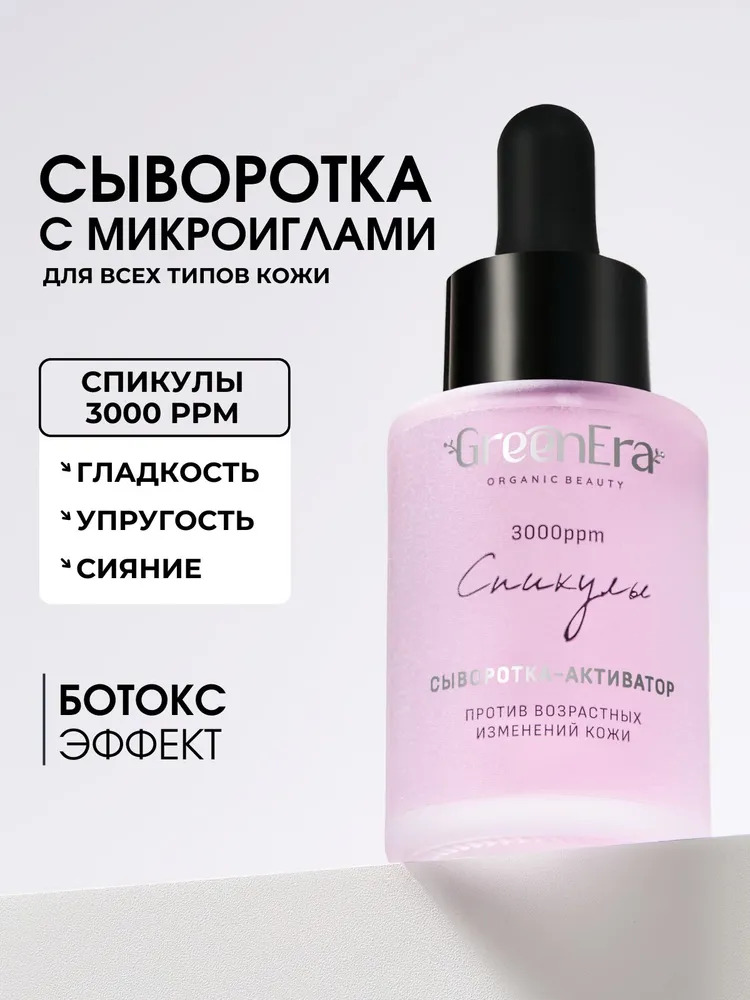 Состав вода, биосахаридная камедь, ниацинамид, сок асаи, низкомолекулярная гиалуроновая кислота, аргирелин, трипептид меди, кофеин, таурин, экстракт ламинарии, экстракт опунции, глицерин, пропиленглик... Показать описаниеоль, белая спикула, ксантановая камедь, бензиловый спирт, этилгексилглицерин, гипоаллергенная ароматическая композиция. Способ применения Наносите 2–3 капли на чистую кожу лица 1 раз в день, предпочтительно вечером. Легкое покалывание — это нормальная реакция на действие спикул. Используйте перед кремом. Избегайте попадания в глаза. Рекомендуется курсом 4–6 недель.