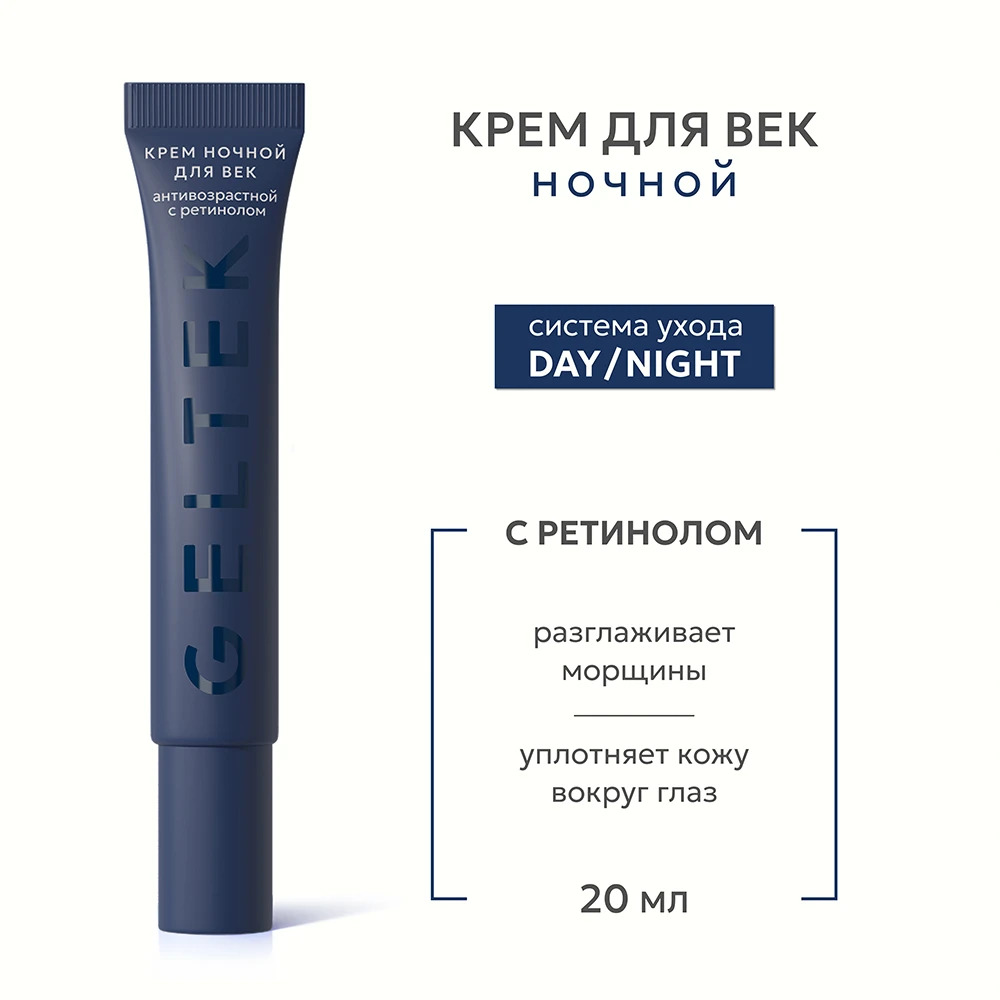 Ночной крем для век разработан специально для возрастной кожи, склонной к сухости. Формула мягко обновляет и укрепляет кожу вокруг глаз, повышая её упругость и тонус. Лёгкая текстура без отдушек комфо... Показать описаниертно распределяется и быстро впитывается, не утяжеляя деликатную зону век. Ретинол обеспечивает бережное и эффективное обновление кожи: уменьшается выраженность морщин, улучшается рельеф и выравнивается тон. Сигнальный пептид матрикин (N-Prolyl Palmitoyl Tripeptide-56 Acetate) стимулирует выработку коллагена и эластина, повышая плотность тканей и усиливая антивозрастной эффект. Экстракт женьшеня улучшает тонус и упругость кожи, помогает уменьшить отёчность и тёмные круги. Кофеин дополняет этот эффект, снижая признаки усталости. Д-пантенол смягчает, устраняет сухость и раздражение, ускоряет заживление микроповреждений. Экстракт солодки обладает осветляющим и успокаивающим действием, а фукогель увлажняет и создаёт тонкую защитную плёнку, предотвращающую потерю влаги. При регулярном использовании крема кожа век становится более гладкой, упругой и ровной, уменьшается выраженность морщин, сухости и тусклости. Линейка Day/Night — это готовая система ухода, учитывающая базовые ежедневные потребности кожи. Все средства линейки интуитивно понятно разделены на три цвета: пенки в бежевом мягко очищают и подготавливают кожу, кремы в розовом обеспечивают дневное увлажнение и защиту, а в синем — работают ночью, поддерживая процессы восстановления и естественного обновления кожи. Day/Night подойдёт тем, кто выбирает полноценный экспертный уход на каждый день без лишних сложностей. Веган Не делались тесты на животных и сперме быка.