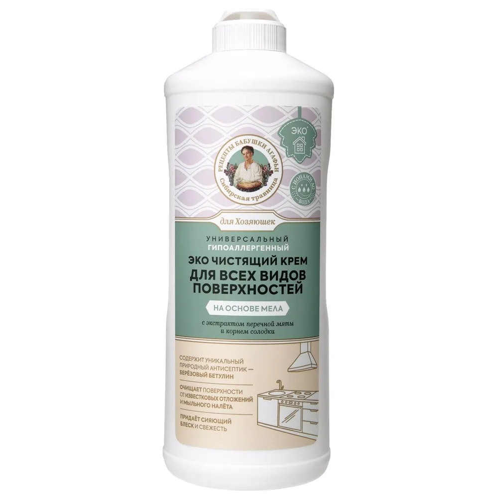 Мы разработали эффективную и безопасную серию моющих средств для дома на основе натуральных компонентов, проверенных временем. Пользуйтесь на здоровье и во благо, дорогие хозяюшки! Универсальный гипоа... Показать описаниеллергенный чистящий крем для всех видов поверхностей на основе мела сварен с душой и заботой по рецептам Агафьи Тихоновны Ермаковой. Он содержит натуральные компоненты, эффективность которых проверена столетиями. Идеально очищает различные поверхности кухни и ванной комнаты. Подходит для столешниц, кафеля, раковин, сантехники, духовок, плит, грилей, СВЧ-печей, противней и сковород. Берёзовая кора в народной медицине используется на протяжении многих веков. С помощью современных технологий мы получили экстракт с высоким уровнем содержащегося в берёзе бетулина – уникального природного антисептика, обладающего доказанным противовирусным и антибактериальным действием. Серебряная вода содержит ионы серебра, которые обеспечивают бактерицидный эффект. Именно на ней изготовлена вся серия бытовой химии от бабушки Агафьи! Натуральный мел прекрасно удаляет стойкие застарелые загрязнения, пригар, известковые отложения, мыльный налёт и въевшуюся грязь. Экстракт перечной мяты и корень солодки нейтрализуют неприятные запахи, борются с бактериями, придают поверхностям чистоту и свежесть. ?Легко удаляет сложные загрязнения ?Растворяет пригоревший жир и въевшийся жир ?Обладает антибактериальным действием ?Не оставляет разводов и царапин ?Обладает приятным ароматом