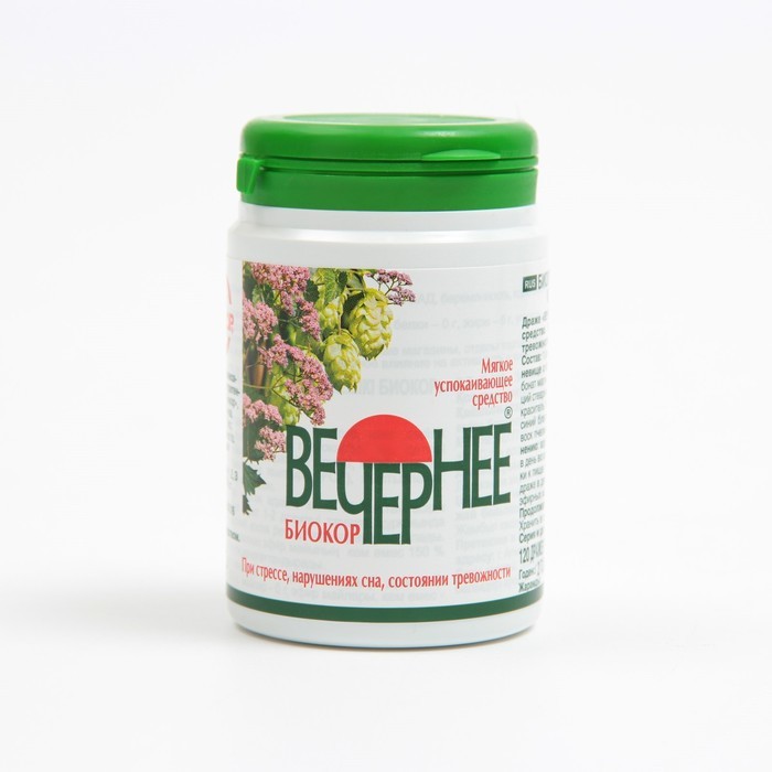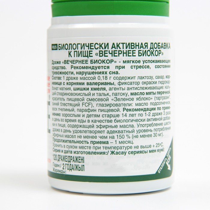 Назначение: употребление шести драже в день удовлетворяет адекватный уровень потребления эфирных масел не менее чем на 150 % (не менее 30 мг). Вечернее «Биокор» – натуральное успокаивающее средство пр... Показать описаниеи нарушениях сна, состоянии тревожности на основе валерианы, мяты и хмеля. * Благодаря природному комплексу трав драже Вечернее «Биокор» обладает мягким успокаивающим и спазмолитическим действием. * Чувство тревоги и нарушение сна больше не помешает вам хорошо выспаться. * Вечернее «Биокор» не вызывает привыкания, трудностей с пробуждением и дневной сонливости. Продолжительность приема — 1 месяц. Способ употребления: взрослым и детям старше 14 лет по 1-2 драже 3 раза в день во время еды в качестве биологически активной добавки к пище, содержащей эфирные масла. Состав: 1 драже массой 0,18 г содержит лактозу, сахар, корневище с корнями валерианы, фиксатор окраски гидрокарбонат магния, шишки хмеля, агенты антислеживающие: кальций стеариновокислый и тальк, патоку, масло мяты перечной, краситель пищевой смесевой «Зеленое яблоко» (тартразин*, синий блестящий FCF), глазирователи: масло подсолнечное, воск пчелиный, парафин пищевой. *Содержит краситель, который может оказывать отрицательное влияние на активность и внимание детей. Противопоказания: индивидуальная непереносимость компонентов БАД, беременность, кормление грудью. Перед применением рекомендуется проконсультироваться с врачом.
