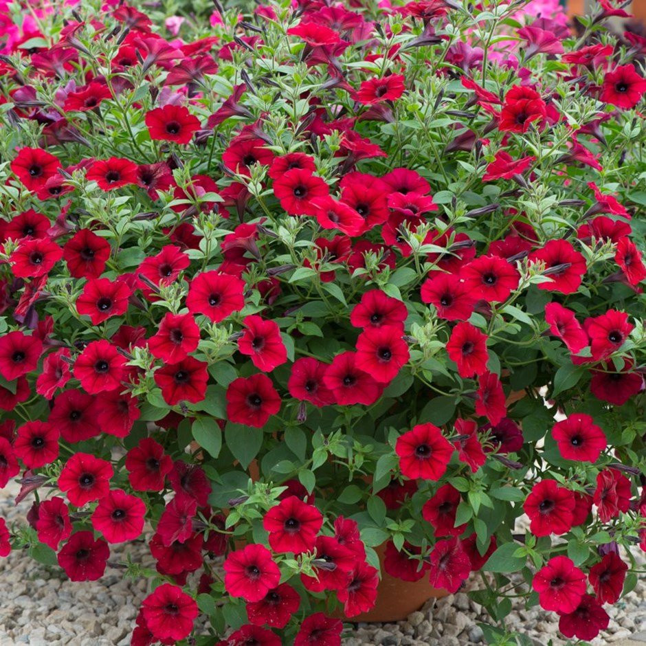 Тайдал Вейв Ред Велюр – ампельная, каскадная петуния со стелющимися побегами, используется в домашнем цветоводстве и при оформлении ландшафтного дизайна. Цветет цветками глубокого оттенка. Гибрид сери... Показать описаниеи Tidal Wave. Гибрид выведен американской компанией PanAmerican Seed. Синонимы названия – Tidal Wave Red Velour. Описание сорта - Куст мощный, выглядит необычно, растет очень быстро, выпуская спускающиеся волнами вниз побеги. Высота растения – 45-55 см, диаметр – 150 см и более. Побеги сильные. В период цветения кусты расцветают велюровыми цветками средних размеров (около 5-6 см), немахровыми, плотными, красной окраски.