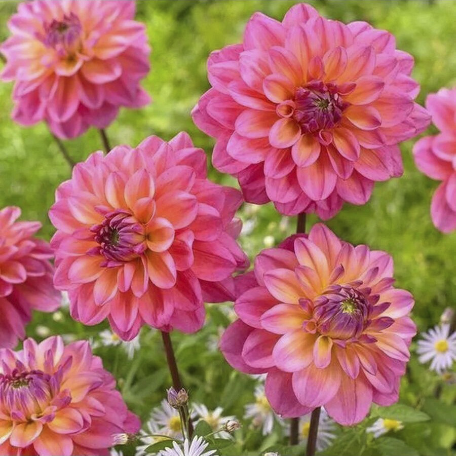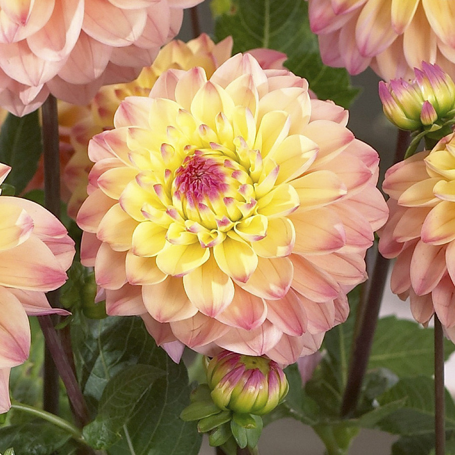 Прекрасная новинка в пастельных тонах! Красивые цветки от розового до светло-желтого. В жизни этот сорта прекрасен также, как и на фото. Идеально подходит для срезки и выглядит потрясающе в горшк... Показать описаниеах. Его очаровательный вид добавляет элегантности любой цветочной композиции, что делает его универсальным выбором для создания красивых букетов. Высота: 80-100 см. Диаметр цветка: 10-15 см. Агротехника: Местоположение: солнечные, защищенные от холодных и сильных ветров места с хорошей циркуляцией воздуха. Нельзя высаживать их на низких и заболоченных участках. Расстояние при посадке зависит от высоты и формы куста того или иного сорта. Участок, выбранный для георгин, должен освещаться днем по крайней мере шесть часов. Почва: богатый перегноем жирный садовый суглинок, рН 6,5-6,7. Хороша для георгинов и удобренная песчаная почва. Участок, предназначенный под георгины, с осени вскапывают, а весной перекапывают. Посадочный материал обычно высаживают в грунт, когда минует угроза возвратных заморозков. В ямы размером 30 х 30 х 30 см, насыпают заранее подготовленный субстрат и комплексное минеральное удобрение. В зависимости от высоты, расстояние между растениями в ряду — 60–90 см. При правильной посадке корневая шейка должна быть на 2-3 см ниже уровня почвы. После посадки растения обильно поливают. Уход за георгинами несложный — обильный полив, мульчирование опилками слоем 6–9 см, подкормки и удаление лишних побегов. Для получения более крупных соцветий обычно удаляют пазушные побеги и выщипывают боковые бутоны. В октябре клубни выкапывают, предварительно обрезав стебли выше корневой шейки на 10–15 см. Клубни очищают от земли и подсушивают. Стебли укорачивают до 3–5 см. Посадочный материал закладывают в ящик с торфом и хранят при температуре от +2 до +6°С.