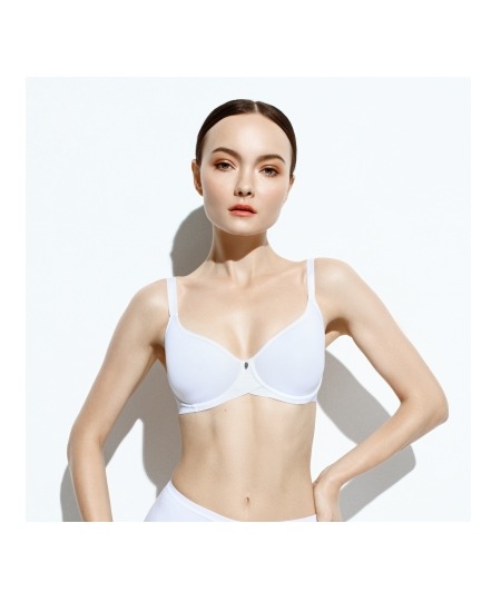 Классический бюстгальтер выполненный из эластичного жаккардового трикотажного полотна, функционального эластичного трикотажного полотна и эластичного кружева. Модель на каркасах, мягкие чашки с тройны... Показать описанием членением и боковой корректирующей деталью.