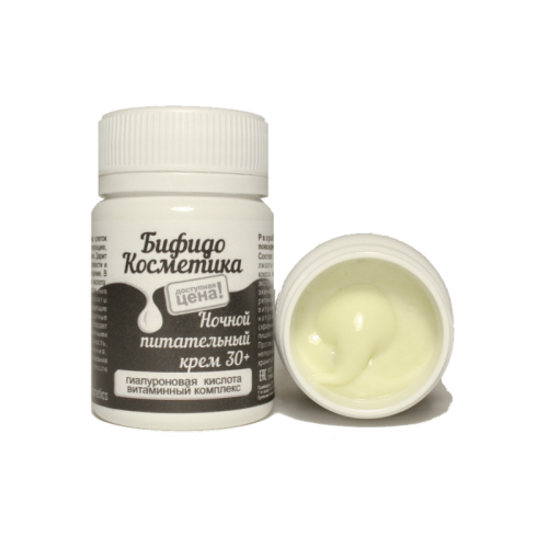 Основное обновление кожи происходит ночью, пока мы спим, поэтому на утро лицо должно выглядеть отдохнувшим и свежим. Если же этого не происходит, Вашему организму остро не хватает питательных веществ,... Показать описание чтобы регенерировать кожный покров. Нежный и в тоже время плотный (по текстуре) крем эффективно насыщает клетки витаминами, смягчает и успокаивает кожу. В его состав входит гиалуроновая кислота, которая отвечает за сохранение жидкости, а так же лизаты бифидобактерий восстанавливающие необходимый баланс микрофлоры и защитные функции организма. Чтобы поддерживать кожу в отличном состоянии ежедневно пользуйтесь ночным кремом Бифидокосметика, созданным с учетом всех возрастных особенностей категории 30+. Питательный, витаминный крем, обладает эффективными антиоксидантными свойствами: устраняет сухость, шелушения и покраснения. Предназначен для использования ежедневно по вечерам (после умывания и очищения кожи). Применение: Наносить вечером тонким слоем на очищенную кожу лица лёгкими похлопывающими движениями до полного впитывания. После вскрытия хранить в холодильнике. Возможна индивидуальная непереносимость. Состав: Вода деминерализованная, лизаты бифидобактерий, масло кокоса, кедрового ореха, миндальное, экстракт шалфея, экстракт хмеля, эхинацеи, гиалуроновая кислота, ретинол (витамин А), д-пантенол, витамин В5, содержит 100% натуральные эссенциальные (эфирные масла), витамины А, Е, И, С, пищевой консервант.