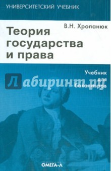Учебник В. Н. Хропанюка "Теория государства и права" приобрел заслуженную популярность среди студентов и преподавателей юридических дисциплин во многих регионах России. Он базируется на принципах исто... Показать описаниеризма, объективности, конкретности, закономерностях формальной и диалектической логики, частнонаучных методах исследования государства и права. В учебнике максимально учтены статика и динамика отечественного законодательства, положительные и отрицательные стороны практики правового регулирования, проанализировано их влияние на общественный и правовой порядок в стране. Предназначено студентам юридических факультетов и вузов, а также всем интересующимся проблемами теории государства и права. 13-е издание, стереотипное. Рейтинг на сайте labirint.ru: 8.25. Больше картинок и возможность полистать книгу на странице.
