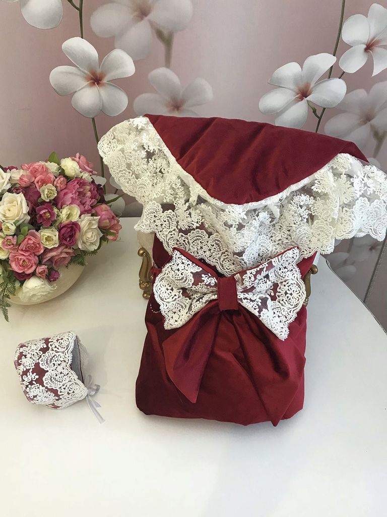 Зимний Конверт-одеяло на выписку "Блюмарим" (бургундия с молочным кружевом, стразами и бантом) без пледаВопросы по товару