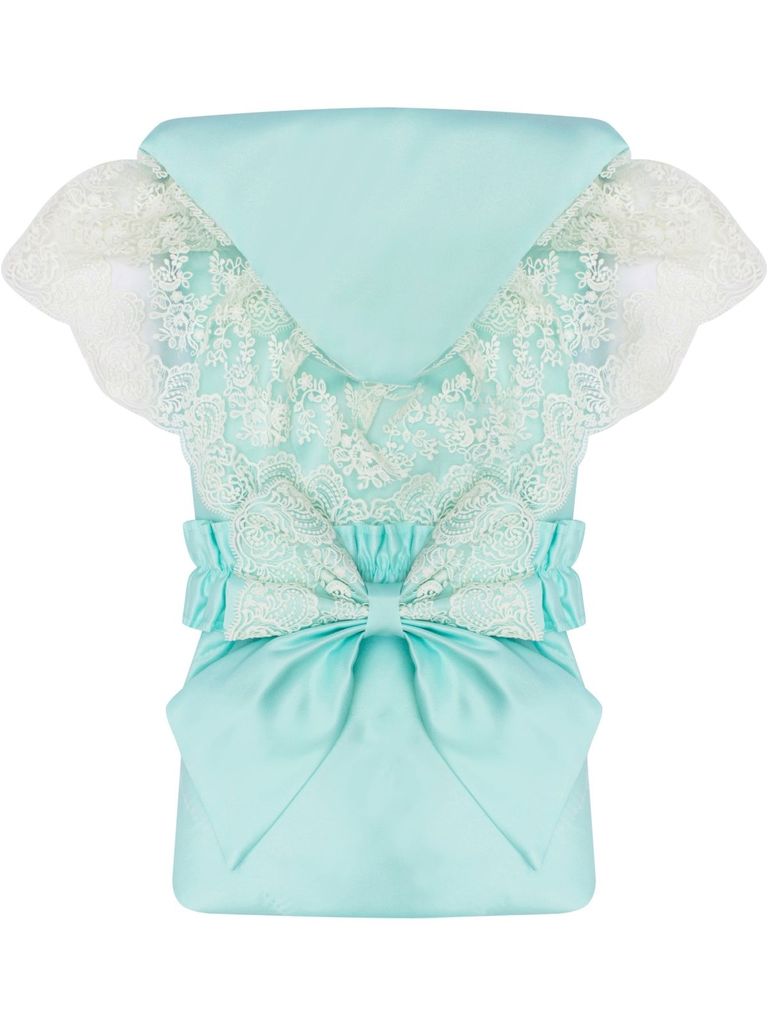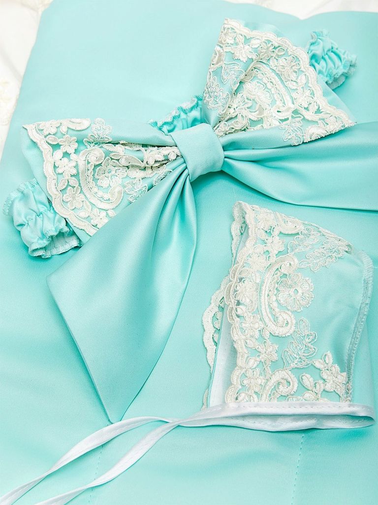 Зимний конверт-одеяло на выписку "Неаполитания" тиффани бирюза с молочным кружевом и бантом без пледаВопросы по товару