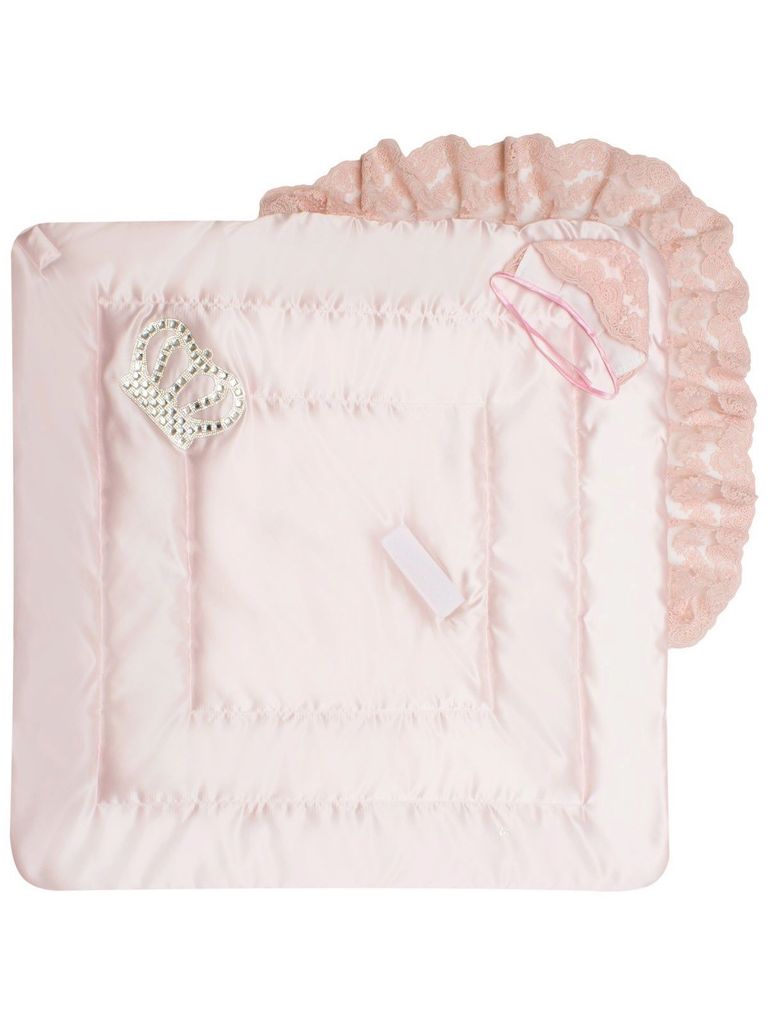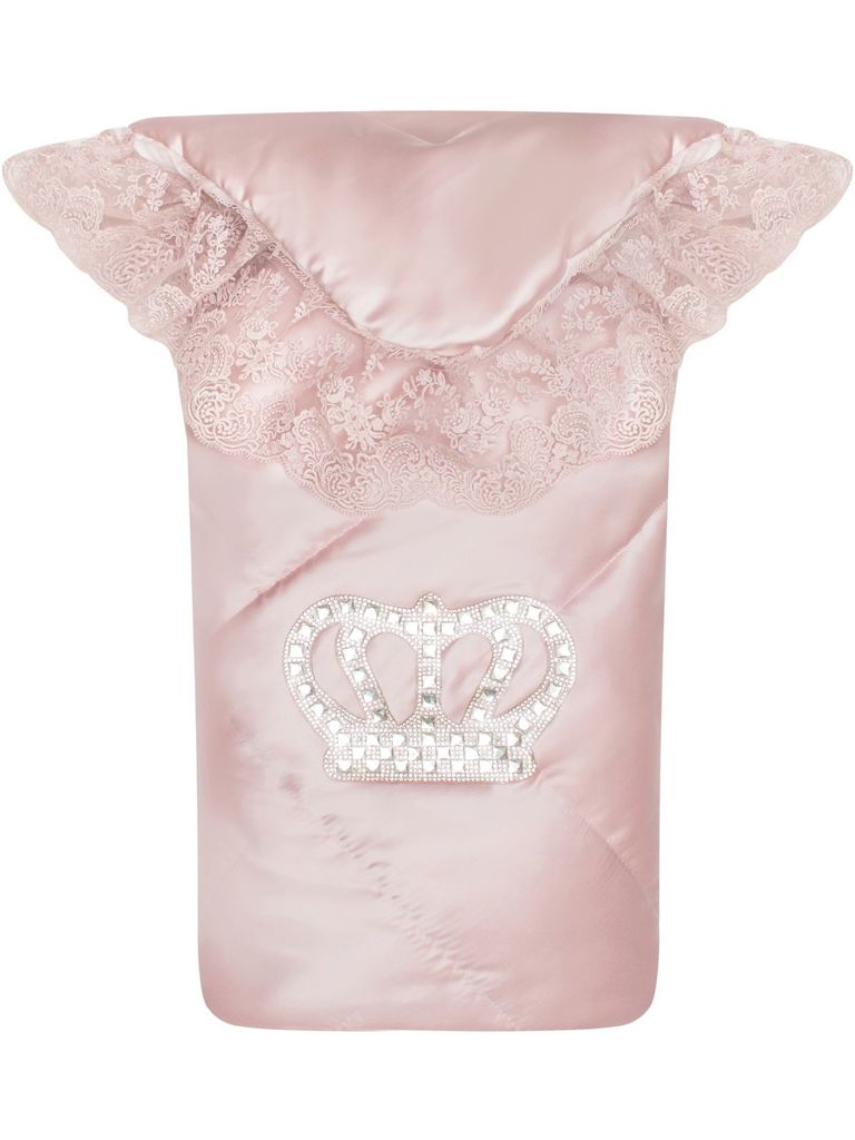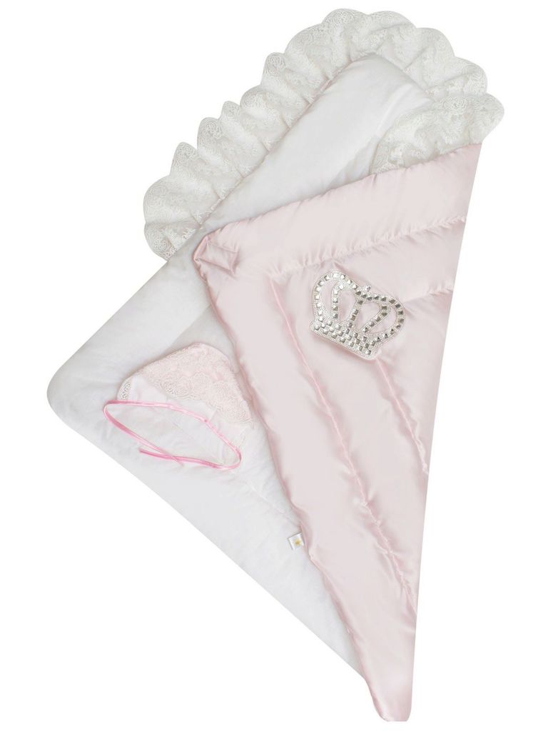 Зимний конверт-одеяло на выписку "Империя" нежно-розовый атлас с белым кружевом и большой короной на липучке без пледаВопросы по товару