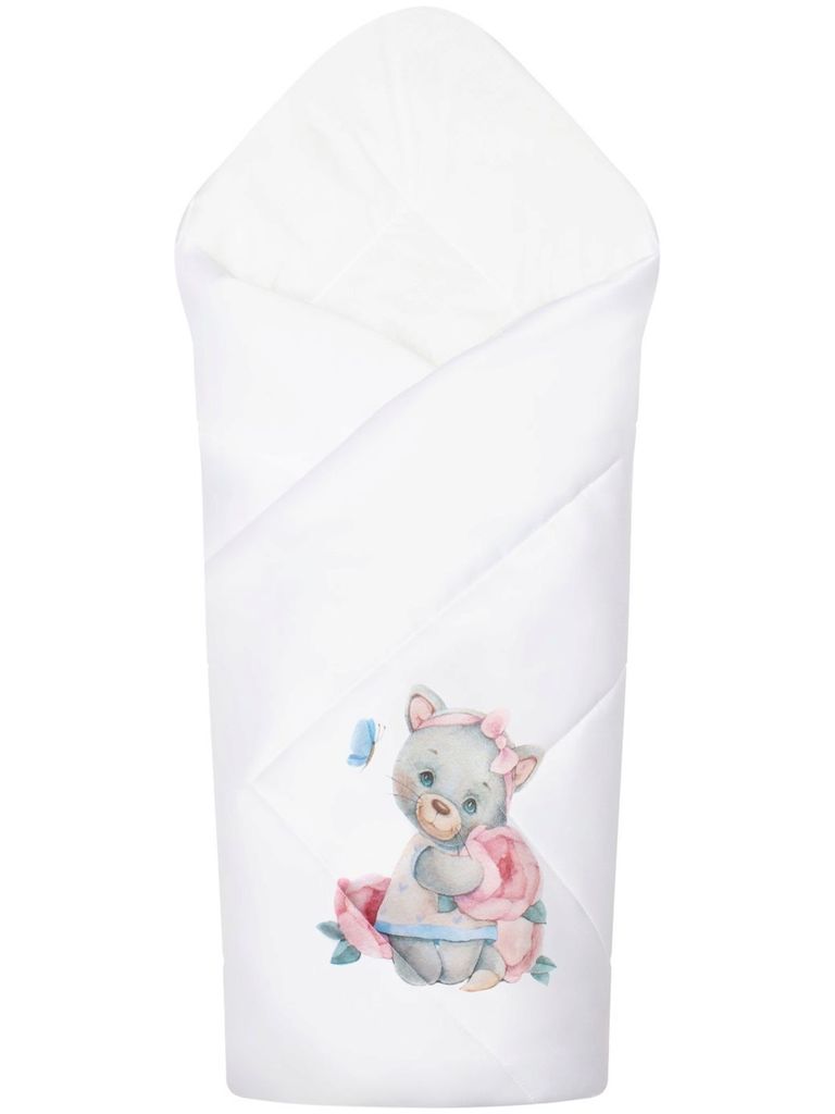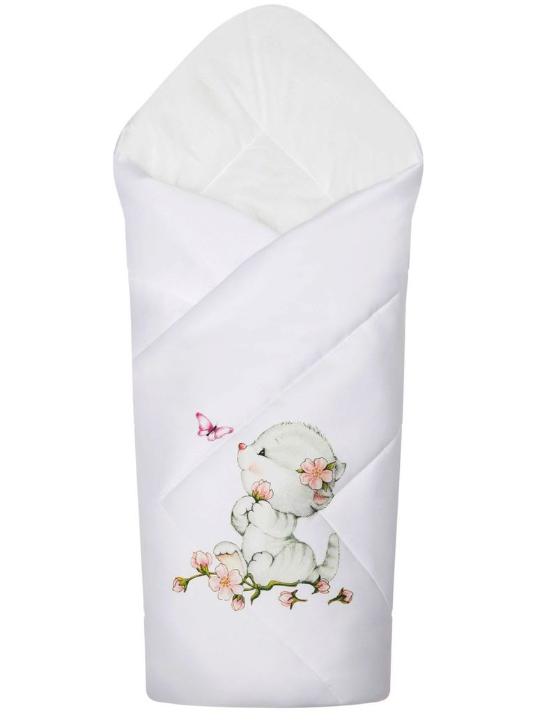Зимний конверт-одеяло на выписку "Киска" (белое, принт без кружева) без пледаВопросы по товару