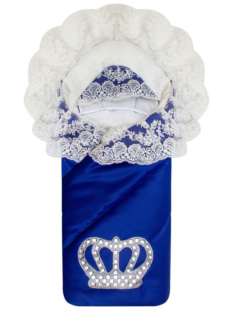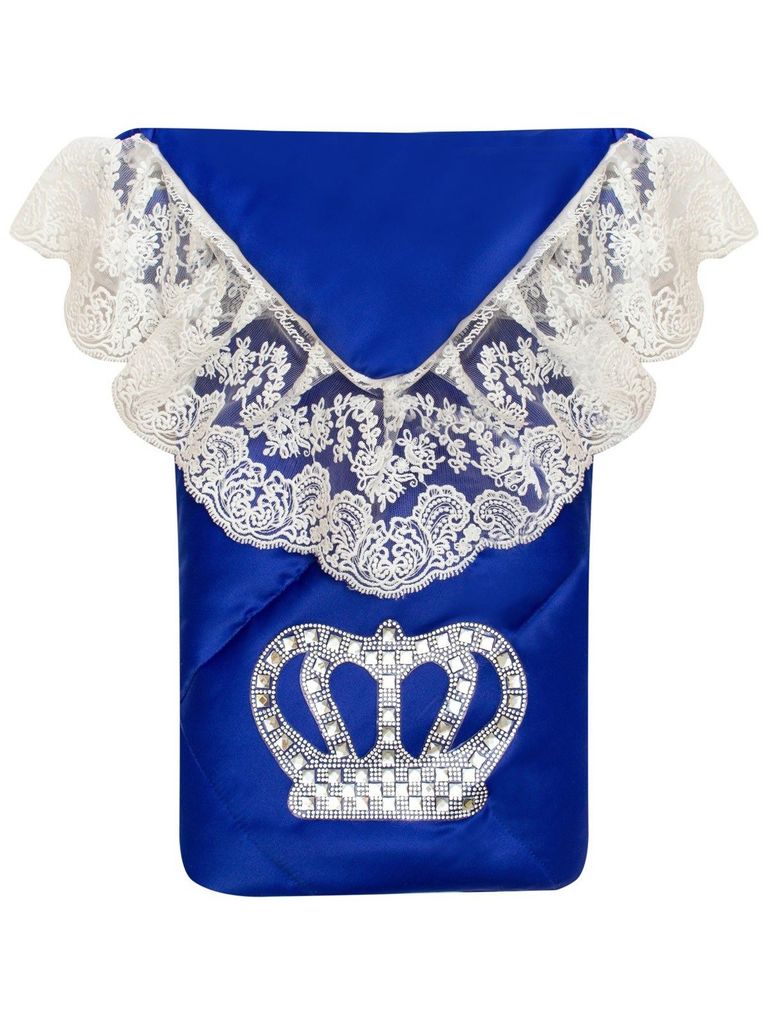 Зимний конверт-одеяло на выписку "Империя" синий с молочным кружевом и большой короной на липучке без пледаВопросы по товару