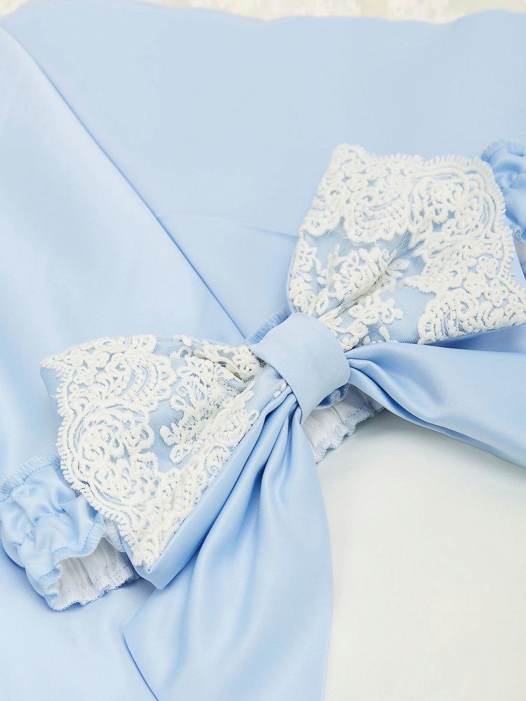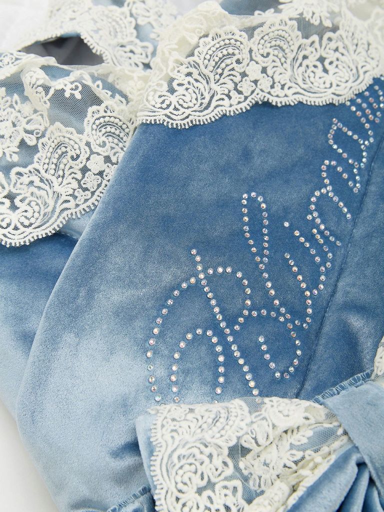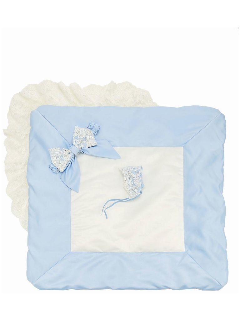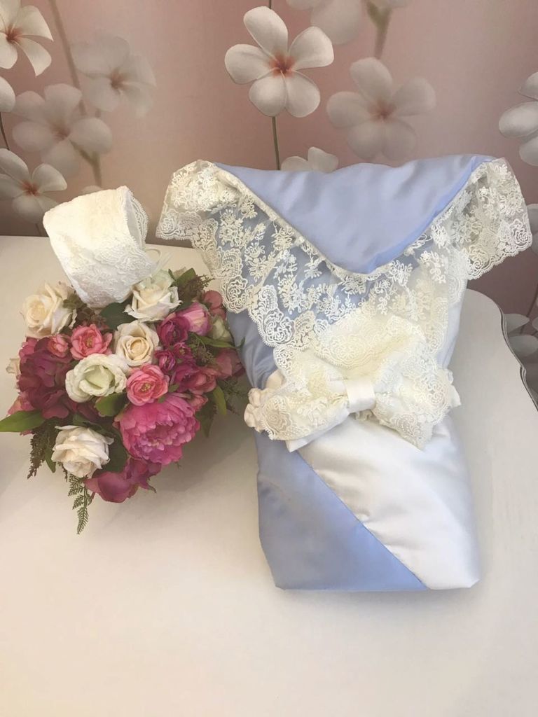 Зимний Конверт-одеяло на выписку "Блюмарим" (голубой с молочным кружевом, стразами и бантом) без пледаВопросы по товару