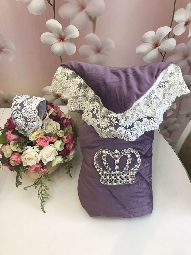 Зимний конверт - одеяло для выписки из роддома Императорский имеет подклад из 100 % хлопка, верх - очень мягкий и качественный бархат, декор итальянское вязанное кружево и надпись из страз. Утеплитель... Показать описание, который используется - премиум класса - бамбуковое волокно. Конверт одеяло - это вещь не на один раз, в дальнейшем им можно пользоваться в кроватке или коляске. В данной моделе плотность утеплителя 300 грамм на квадратный метр (зима), что обеспечивает комфортную выписку ребенка в зимний период при температуре от 0 до -35 градусов по Цельсию, любая модель может быть изготовлена в любом сезоне. В комплект входит меховой плед на овчине и чепчик без утепления для фотосессии.