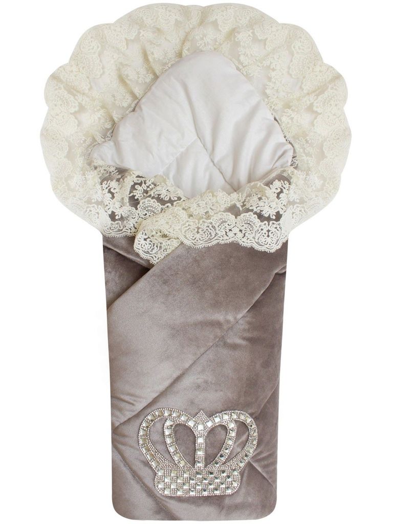 Зимний Конверт-одеяло на выписку "Императорский" (серый с молочным кружевом и большой короной на липучке) без пледаВопросы по товару