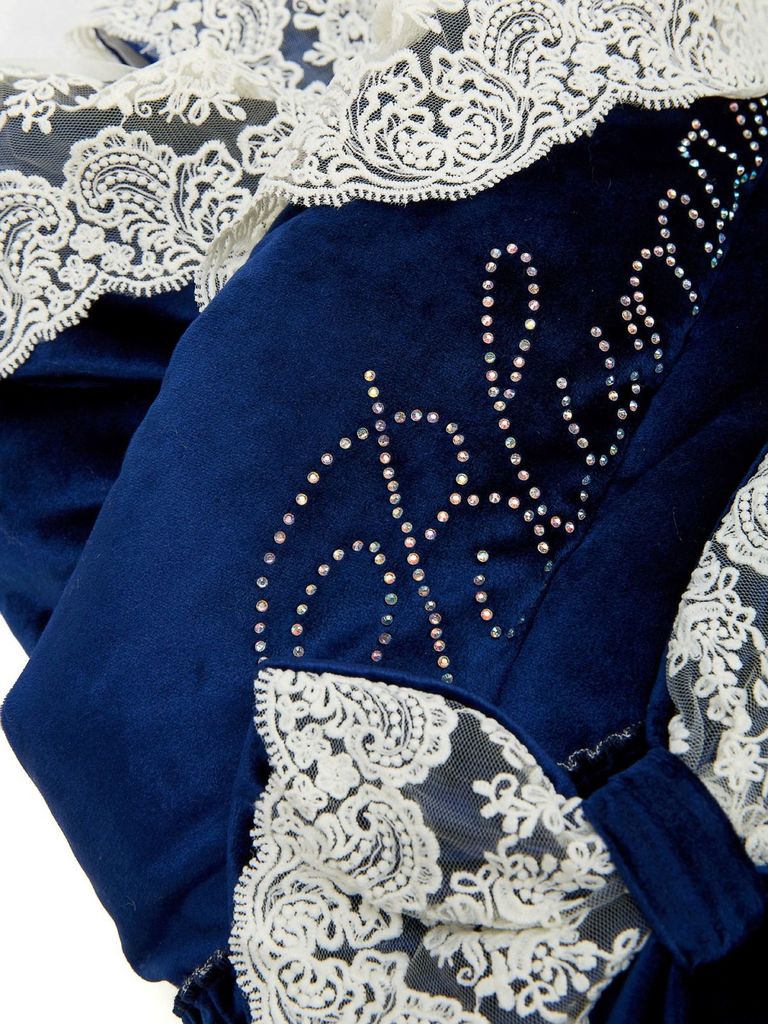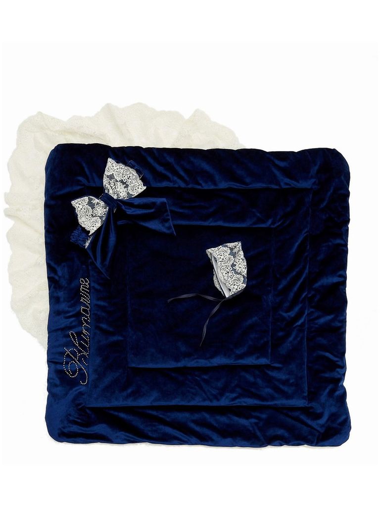 Зимний Конверт-одеяло на выписку "Блюмарим" (темно-синий с молочным кружевом, стразами и бантом) без пледаВопросы по товару