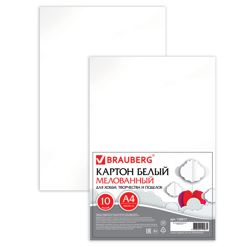 Картон белый А4 МЕЛОВАННЫЙ, 10 листов, BRAUBERG, 200х290мм, 128017Картон белый А4 МЕЛОВАННЫЙ, 10 листов, BRAUBERG, 200х290мм, 128017