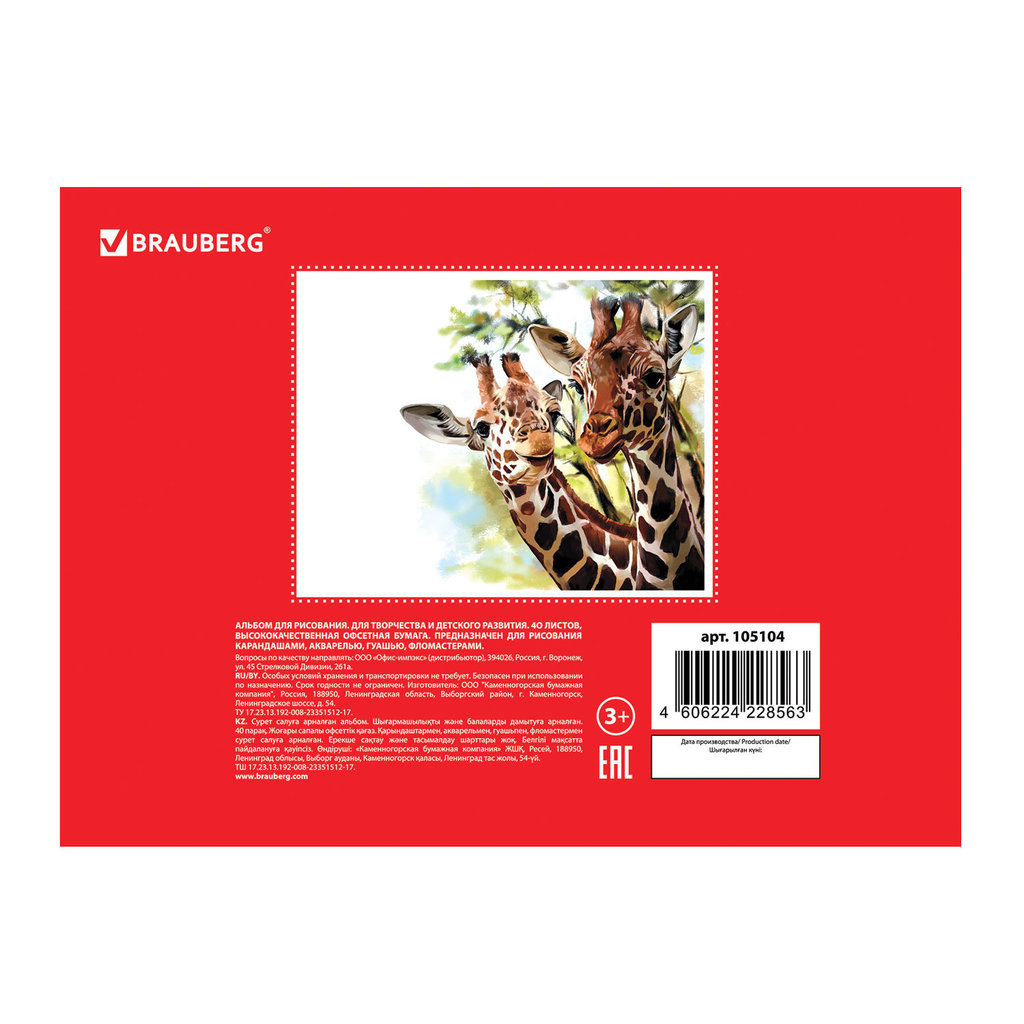 Альбом для рисования А4 40 л., скоба, обложка картон, BRAUBERG, 200х283 мм, Дикие животные (2 вида), 104876 Вопросы по товару