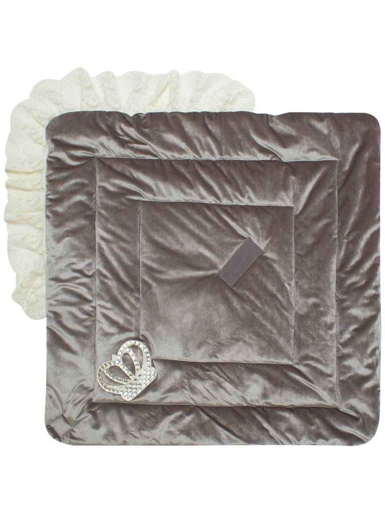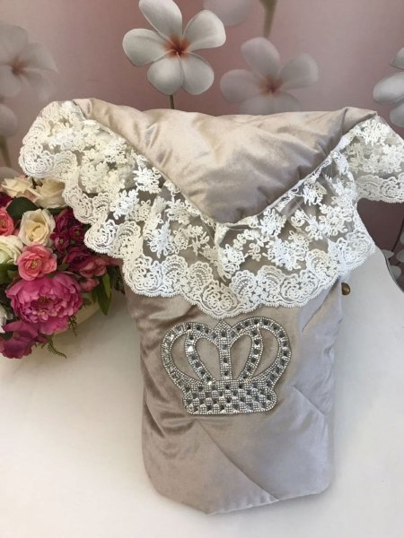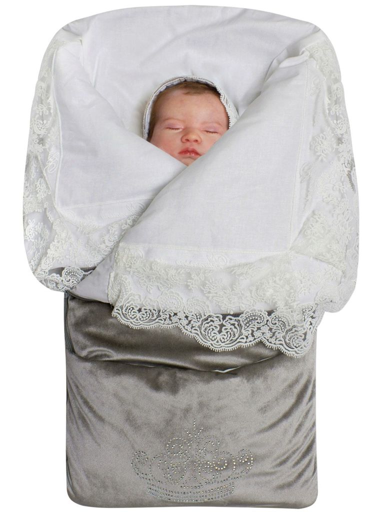 Летний конверт-одеяло на выписку "Императорский" (серый с молочным кружевом и большой короной на липучке)Вопросы по товару