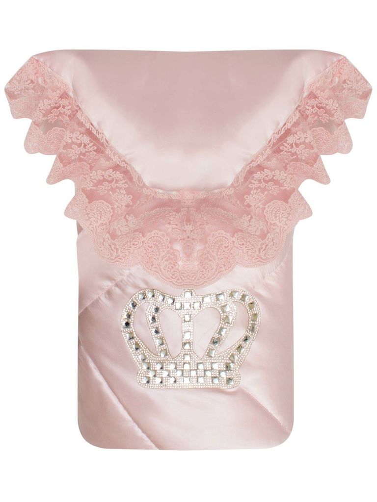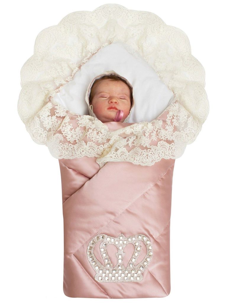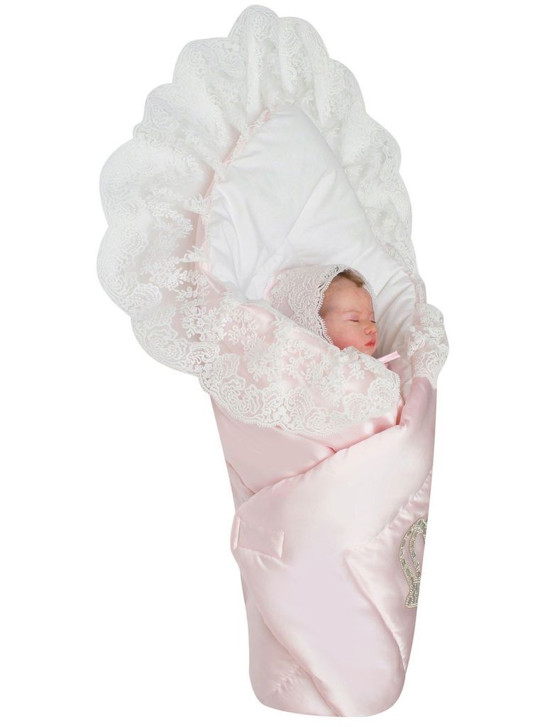 Летний конверт-одеяло на выписку "Империя" нежно-розовый атлас с белым кружевом и большой короной на липучкеВопросы по товару