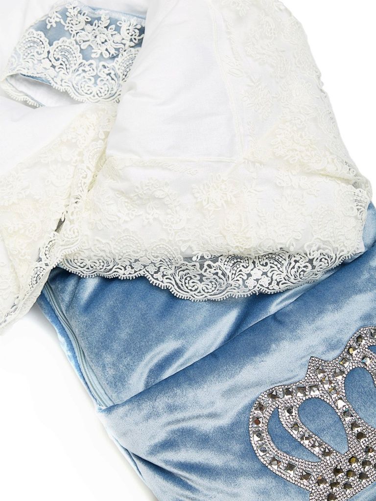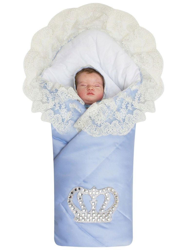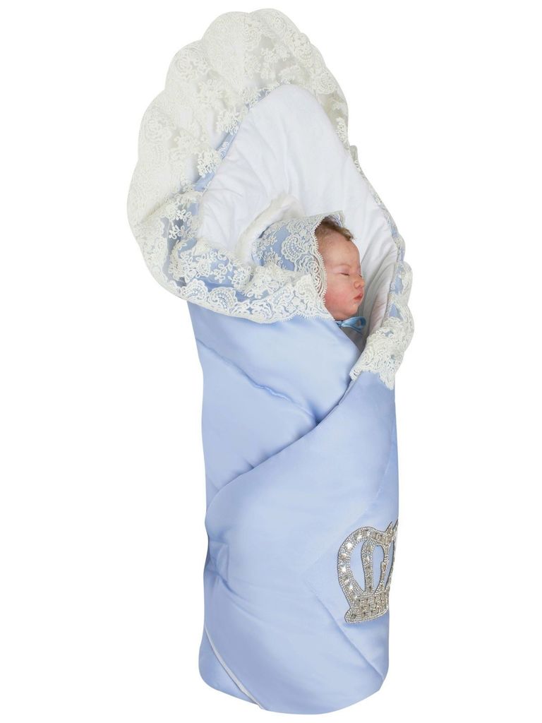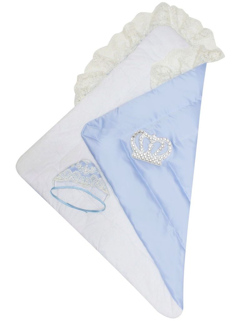 Летний конверт-одеяло на выписку "Империя" голубой с молочным кружевом и большой короной на липучкеВопросы по товару