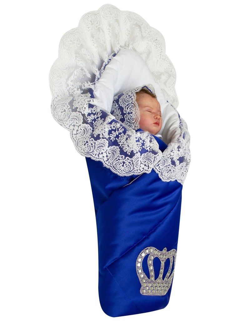 Летний конверт-одеяло на выписку "Империя" синий с молочным кружевом и большой короной на липучкеВопросы по товару