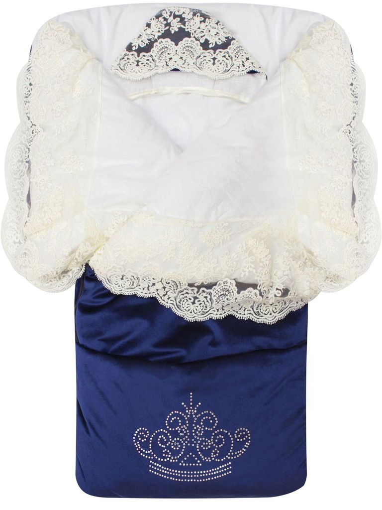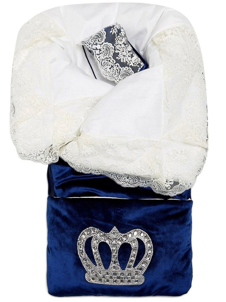 Летний конверт-одеяло на выписку "Императорский" (темно-синий с молочным кружевом и большой короной на молнии)Вопросы по товару