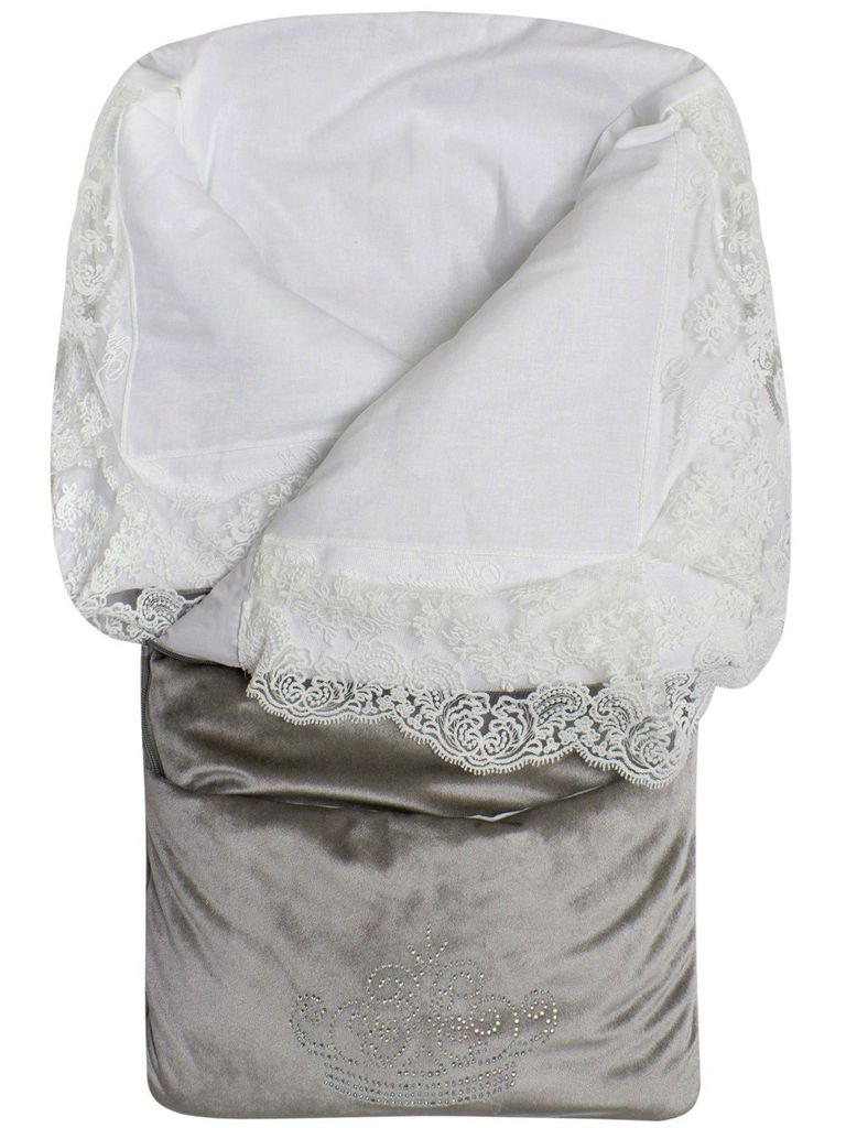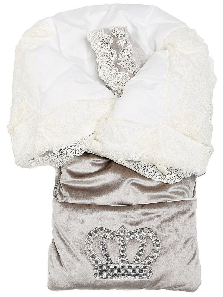 Летний конверт-одеяло на выписку "Императорский" (серый с молочным кружевом и большой короной на молнии)Вопросы по товару