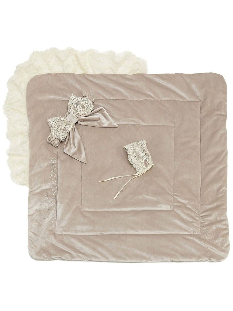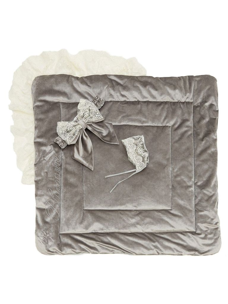 Летний конверт-одеяло на выписку "Блюмарим" (серый с молочным кружевом, стразами и бантом)Вопросы по товару