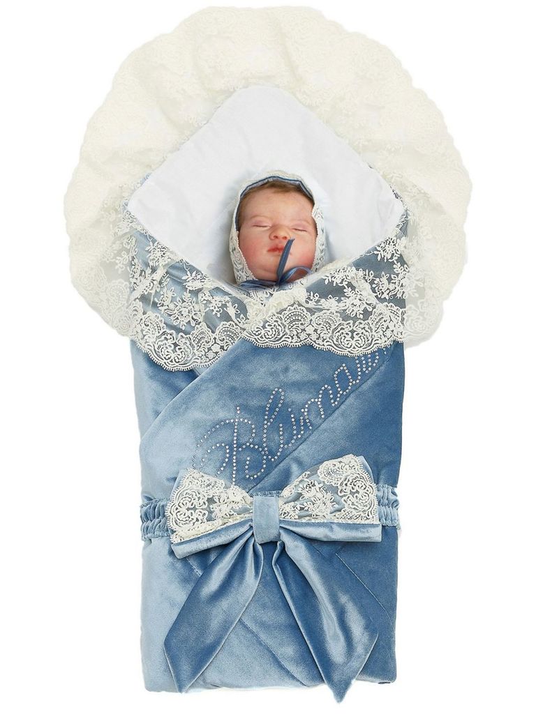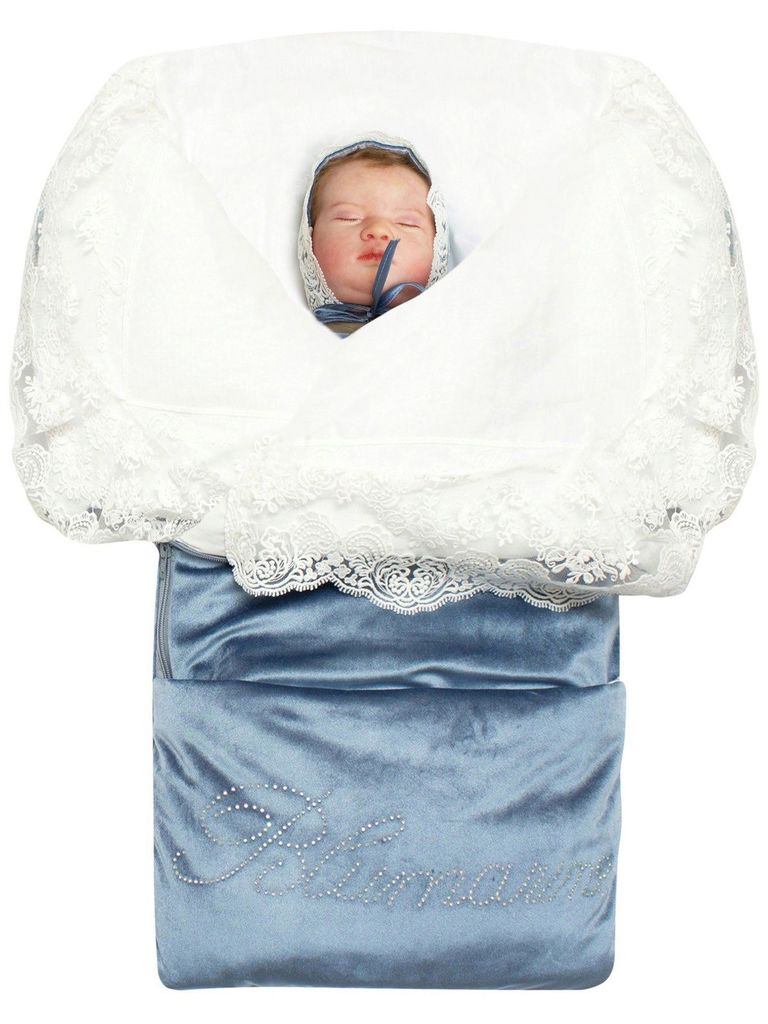 Летний конверт-одеяло на выписку "Герцог" (голубой с молочным кружевом и стразами на молнии)Вопросы по товару