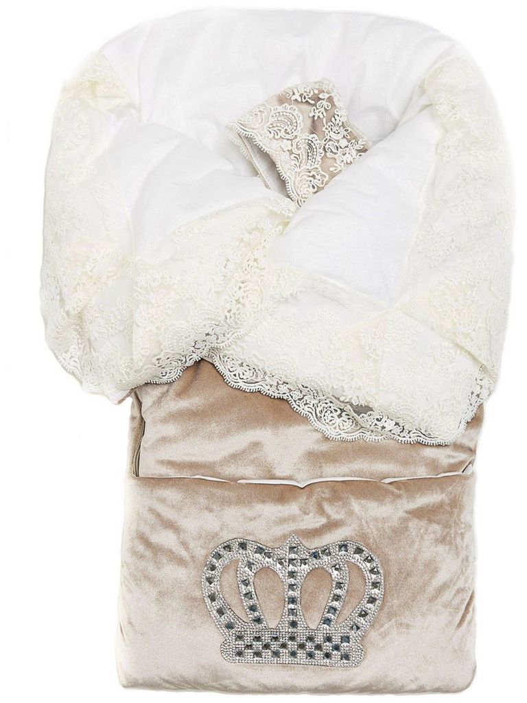 Летний конверт-одеяло на выписку "Императорский" (бежевый с молочным кружевом и большой короной на молнии)Вопросы по товару