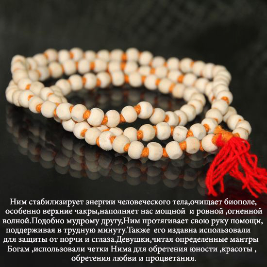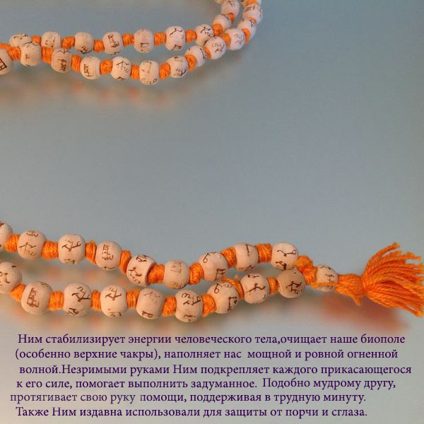 Чётки используют в медитации и молитве. Представляют собой нить, на которой бусины чередуются с узелками, что придаёт четкам дополнительную прочность и не даёт рассыпаться при разрыве. Чётки сделаны и... Показать описаниез священного дерева Ним. Это легендарное дерево Индии. Ним стабилизирует энергии человеческого тела, очищает наше биополе (особенно верхние чакры), наполняет нас мощной и ровной огненной волной. ЧЕТКИ ИЗ ДЕРЕВА НИМ! Дакини и Шанкхини — две спутницы, сопровождающие Господа Шиву и его супругу. Относясь к злым духам, они причиняют людям множество неприятностей. Но, по поверью, эти нечистые духи не могут приблизиться к дереву ним. По крайней мере, с медицинской точки зрения признано, что древесина нима обладает сильнейшим антисептическим свойством. В прошлом было принято сажать дерево ним перед домом. По обочинам больших дорог Индии, особенно в штате Уттар-Прадеш, растут тысячи этих деревьев. Ним настолько сильный антисептик, что в аюрведической медицине его используют даже для лечения проказы. Ученые-медики научились извлекать из нима активное вещество, которое носит название маргозиновой кислоты. Ним используют повсеместно, в частности для чистки зубов. Подавляющее большинство жителей индийских деревень используют для этого веточки нима. В старинной индийской пословице говорится, что на земле, где произрастают деревья Ним, нет места смертям и болезням. Организация Объединенных Наций присвоила дереву Ним почетный титул «дерева 21 века». Американский Национальный научный совет заявил, что Ним — это наиболее перспективное из всех лекарственных растений, возвещающее новую эру пестицидов. Оно может обеспечить миллионы людей недорогими лекарствами и даже бороться с всемирным потеплением».