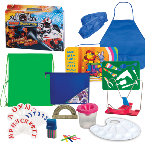 Комплектация. Подставка для книг - 1 шт. Настольное покрытие для творчества - 1 шт. Веер гласные - 1 шт. Веер согласные - 1 шт. Фартук для труда - 1 шт. Нарукавники для труда - 1 шт. Линейка первоклас... Показать описаниесника - 1 шт. Треугольник - 1 шт. Транспортир - 1 шт. Трафарет-раскраска - 1 шт. Закладки - 2 шт. Счетные палочки - 50 шт. Стакан-непроливайка - 1 шт. Палитра художника - 1 шт. Сумка для сменной обуви - 1 шт. Папка на молнии А5 - 1 шт.