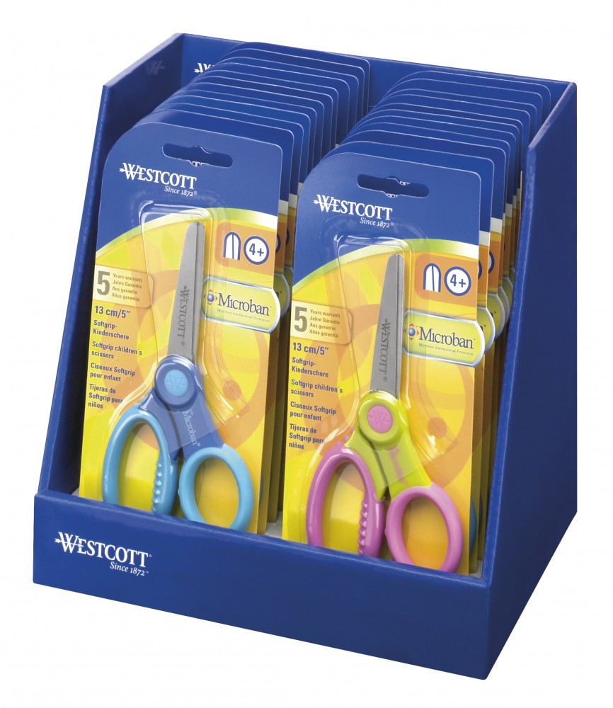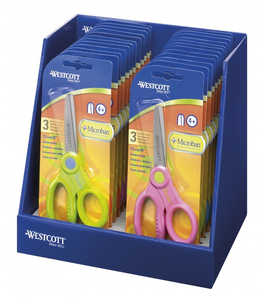 НОЖНИЦЫ ШКОЛЬНЫЕ 13 СМ С АНТИБАКТЕРИАЛЬНЫМ ПОКРЫТИЕМ MICROBAN, ЗАКРУГЛЕННОЕ ЛЕЗВИЕ, ПЛАСТИКОВЫЕ РУЧКИ, 4 ЦВЕТА В АССОРТИМЕНТЕ, ДИСПЛЕЙ