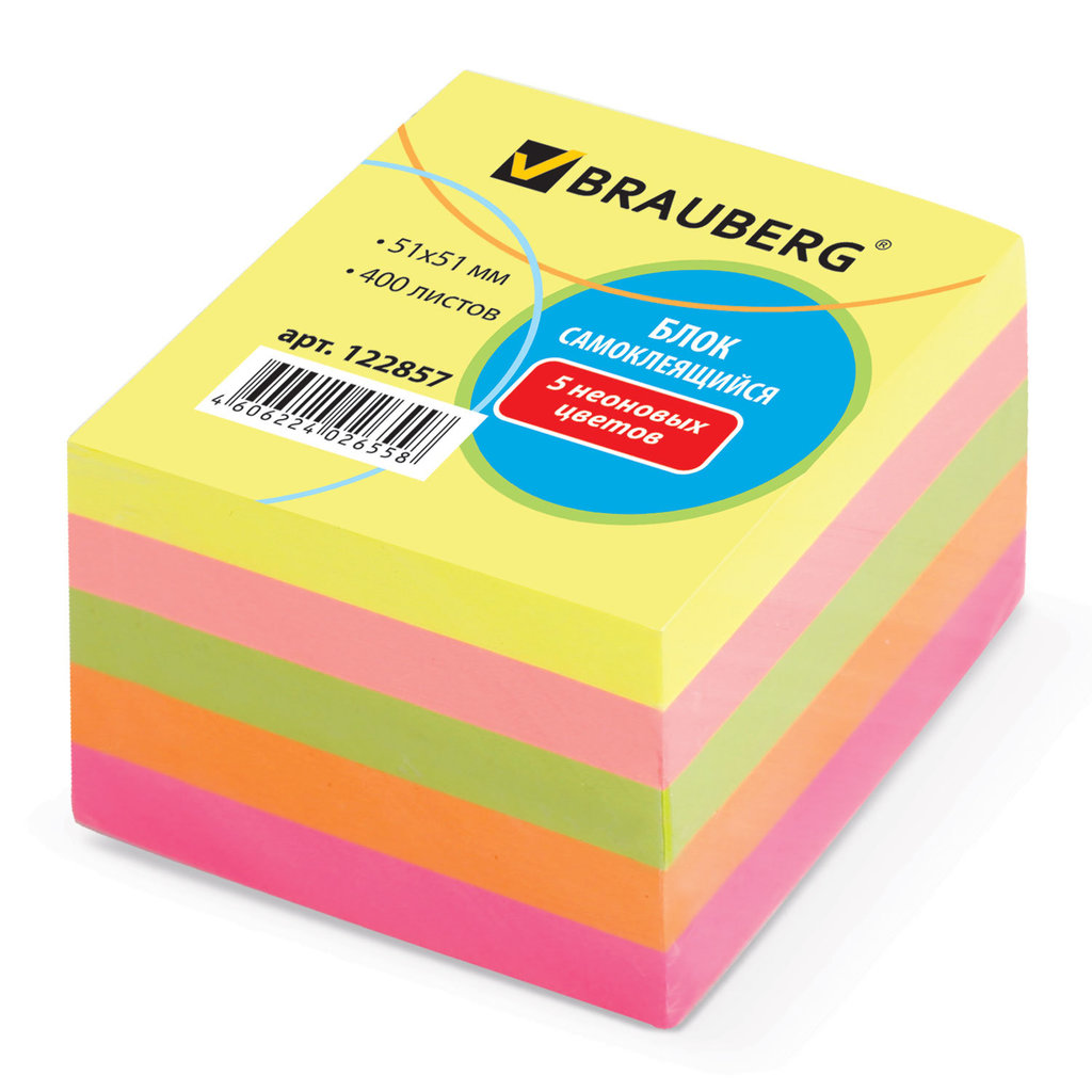 Блок самоклеящийся (стикеры) BRAUBERG НЕОНОВЫЙ 51х51мм, 400 листов, 5 цветов, 122857