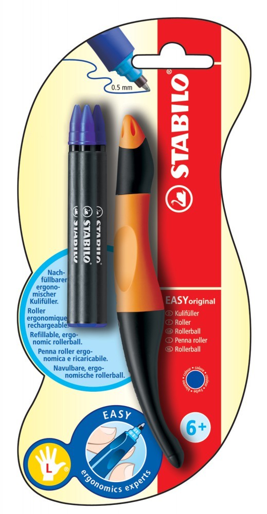 РУЧКА РОЛЛЕР STABILO S'MOVE EASY В БЛИСТЕРЕ + 3 СТЕРЖНЯ, ДЛЯ ЛЕВШЕЙ,   КОРПУС ОРАНЖЕВО-ЧЕРНЫЙ, ЦВЕТ ЧЕРНИЛ: СИНИЙ, 0,5ММ БЛИСТЕР