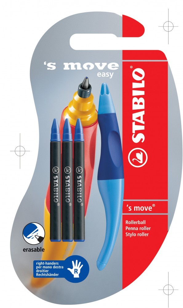 РУЧКА РОЛЛЕР STABILO S'MOVE EASY В БЛИСТЕРЕ + 3 СТЕРЖНЯ, ДЛЯ ПРАВШЕЙ,   КОРПУС СИНЕ-ГОЛУБОЙ, ЦВЕТ ЧЕРНИЛ: СИНИЙ, 0,5ММ БЛИСТЕР