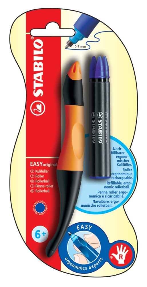 РУЧКА РОЛЛЕР STABILO S'MOVE EASY В БЛИСТЕРЕ + 3 СТЕРЖНЯ, ДЛЯ ПРАВШЕЙ,   КОРПУС ОРАНЖЕВО-ЧЕРНЫЙ, ЦВЕТ ЧЕРНИЛ: СИНИЙ, 0,5ММ БЛИСТЕР