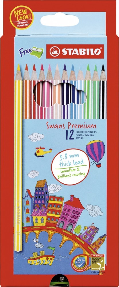 НАБОР УКОРОЧЕННЫХ ЦВЕТНЫХ КАРАНДАШЕЙ STABILO SWANS PREMIUM EDITIONAL В ВЫДВИГАЮЩЕМСЯ ФУТЛЯРЕ-ПОДСТАВКЕ, 12 ЦВЕТОВ + ТОЧИЛКА, КАРТОН