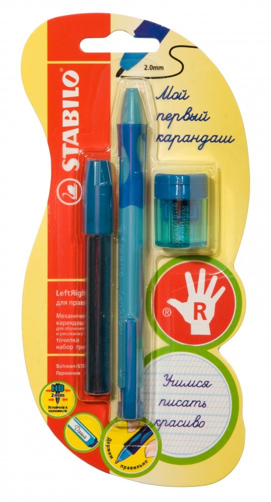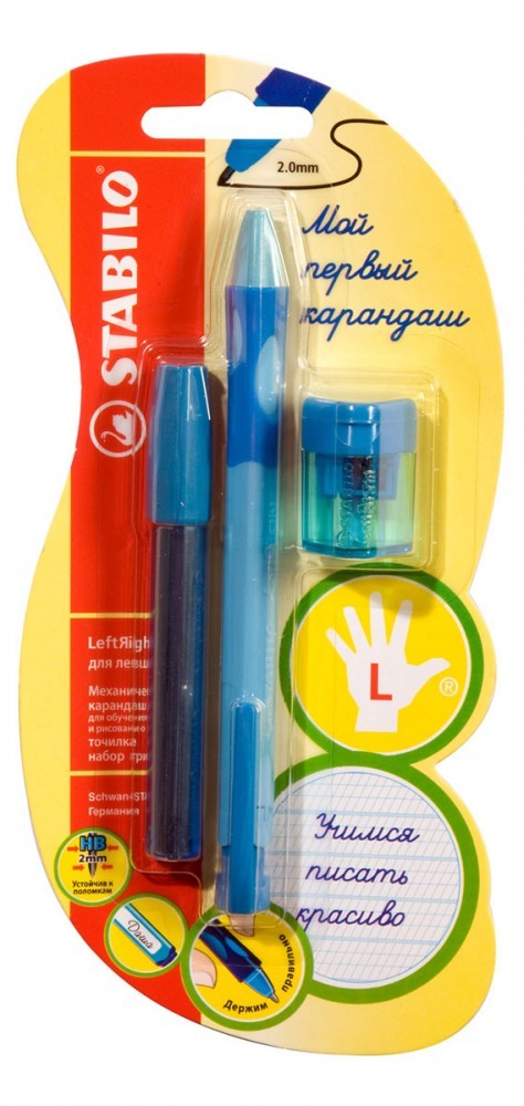 НАБОР STABILO LEFTRIGHT Д/ЛЕВШЕЙ: МЕХАНИЧЕСКИЙ КАРАНДАШ, ГРИФЕЛИ, ТОЧИЛКА. КОРПУС ГОЛУБОЙ, БЛИСТЕР. Вопросы по товару