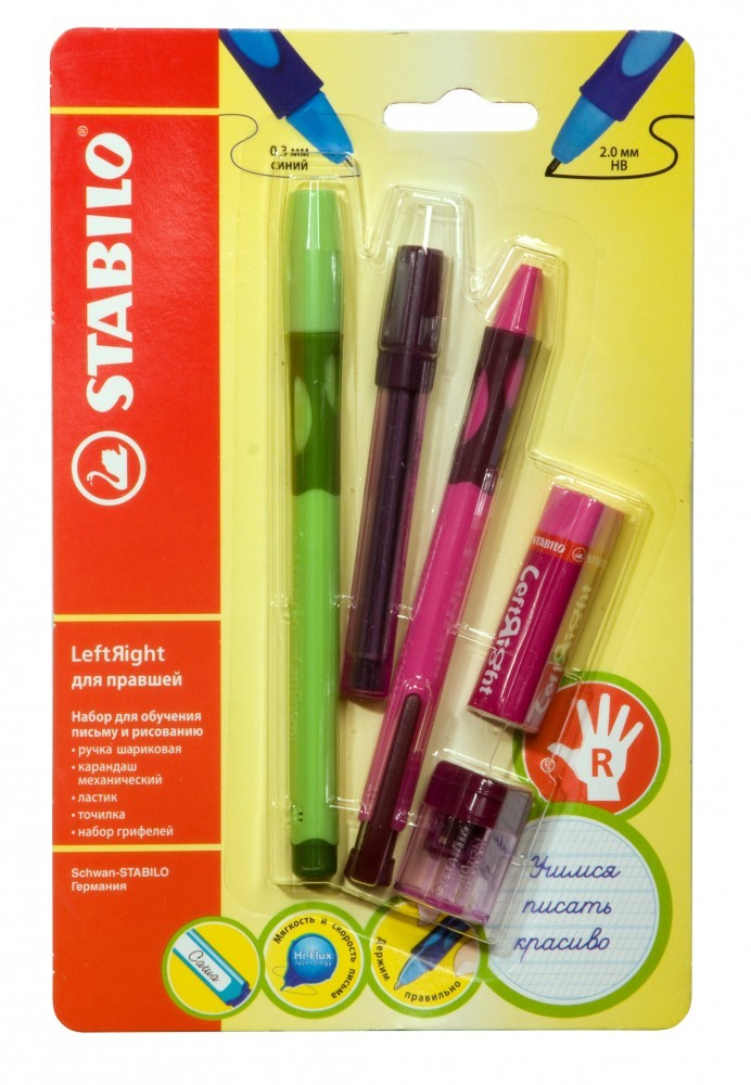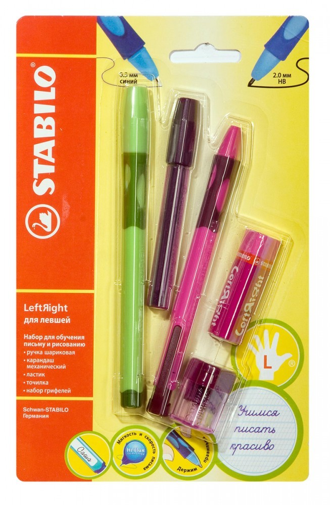 НАБОР STABILO LEFTRIGHT  Д/ЛЕВШЕЙ: ШАРИКОВАЯ РУЧКА, МЕХАНИЧЕСКИЙ КАРАНДАШ, ГРИФЕЛИ, ЛАСТИК, ТОЧИЛКА, КОРПУС РОЗОВЫЙ-ЗЕЛЕНЫЙ, БЛИСТЕР
