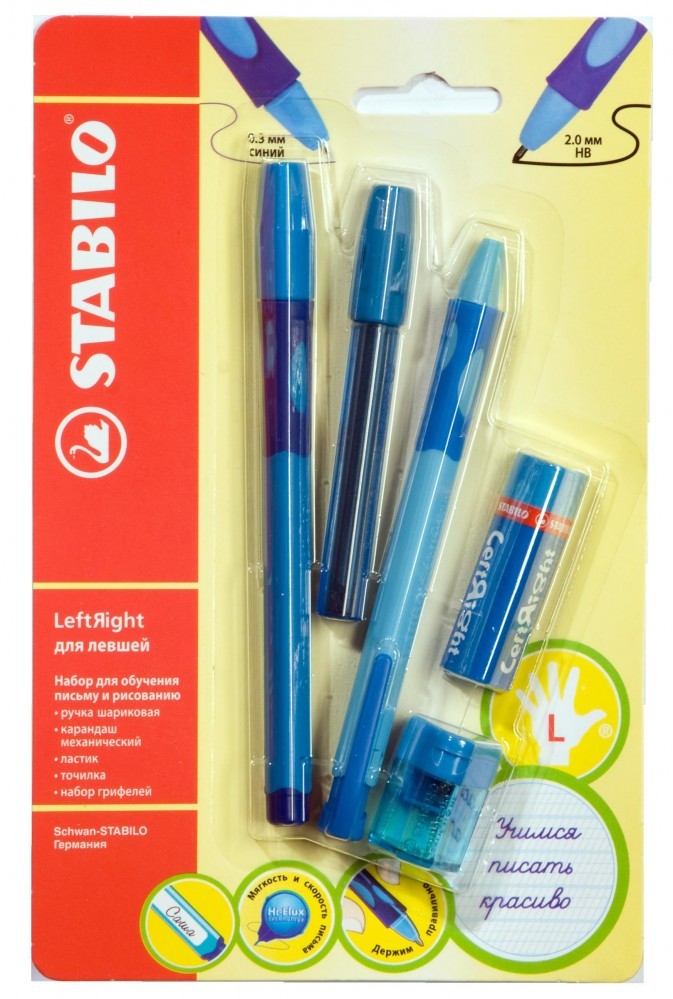 НАБОР STABILO LEFTRIGHT  Д/ЛЕВШЕЙ: ШАРИКОВАЯ РУЧКА, МЕХАНИЧЕСКИЙ КАРАНДАШ, ГРИФЕЛИ, ЛАСТИК, ТОЧИЛКА, КОРПУС ГОЛУБОЙ, БЛИСТЕР