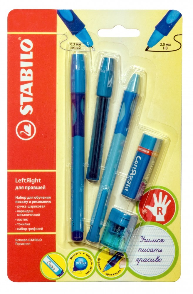 НАБОР STABILO LEFTRIGHT Д/ПРАВШЕЙ: ШАРИКОВАЯ РУЧКА, МЕХАНИЧЕСКИЙ КАРАНДАШ, ГРИФЕЛИ, ЛАСТИК, ТОЧИЛКА, КОРПУС ГОЛУБОЙ, БЛИСТЕР