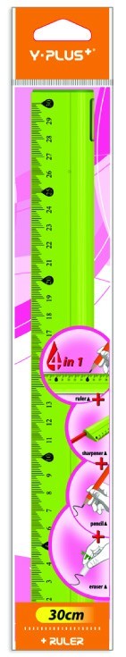Линейка многофункциональная Y-Plus 30см, пластик. Линейка+точилка+ч/г карандаш+ластик. Блистер