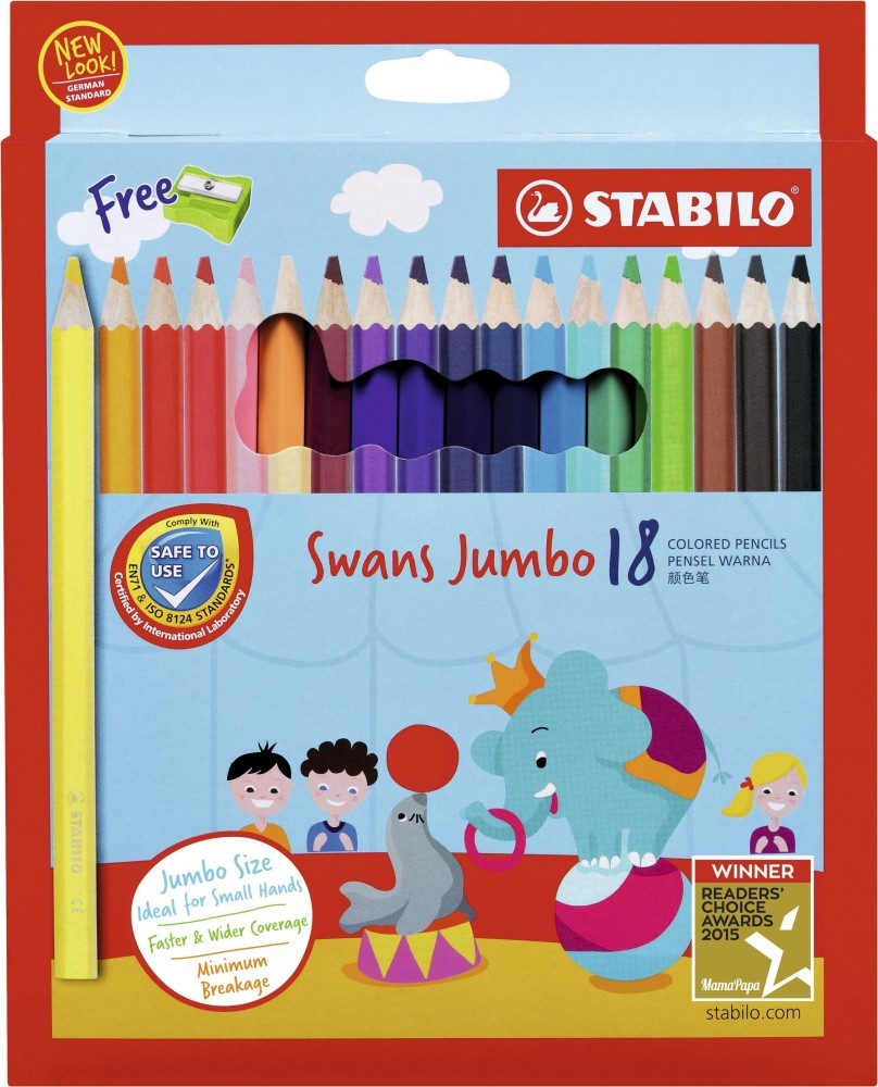 НАБОР УТОЛЩЕННЫХ ЦВЕТНЫХ КАРАНДАШЕЙ STABILO SWANS JUMBO В ВЫДВИГАЮЩЕМСЯ ФУТЛЯРЕ-ПОДСТАВКЕ, 18 ЦВЕТОВ + ТОЧИЛКА, КАРТОН