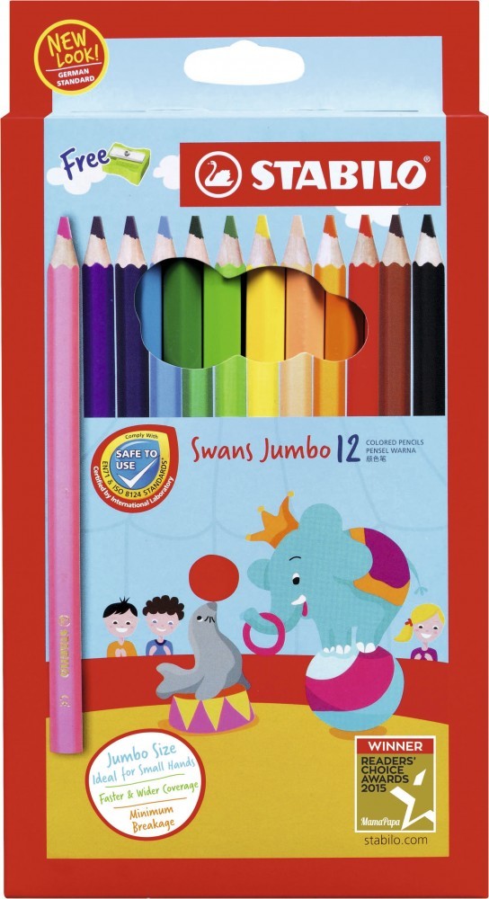 НАБОР УТОЛЩЕННЫХ ЦВЕТНЫХ КАРАНДАШЕЙ STABILO SWANS JUMBO В ВЫДВИГАЮЩЕМСЯ ФУТЛЯРЕ-ПОДСТАВКЕ, 12 ЦВЕТОВ + ТОЧИЛКА, УКОРОЧЕННЫЕ, КАРТОН
